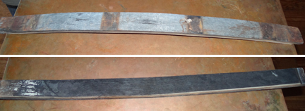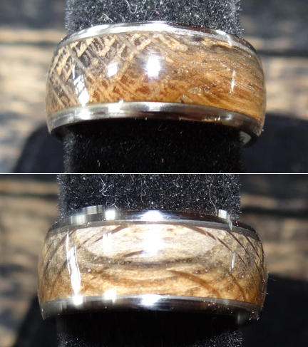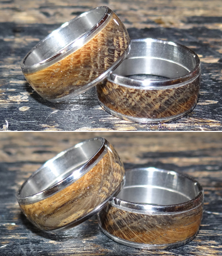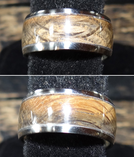 So a friend, whose family has worked for Jack Daniels forever, asked me to make two rings out of a Jack Daniels barrel stave. So FedEx delivered a couple of staves and here is how the rings turned out. The cream color is the natural color of the white oak and the dark parts are where the Jack darkened the wood during the aging process.