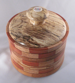 The box is a "Beads of Courage" box to be sent to a Children's hospital in our state. This was my first attempt at making a segmented bowl. The woods I used are: top - Spalted Hackberry. The sides are segments of Oak, Boxwood Elder, and Apple. The Bottom is Angelim Pedra and Red Heart.