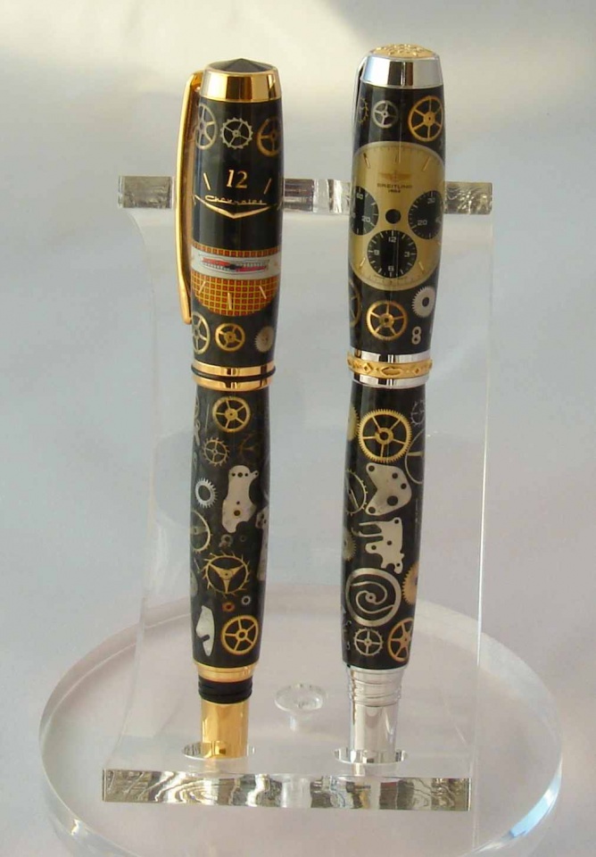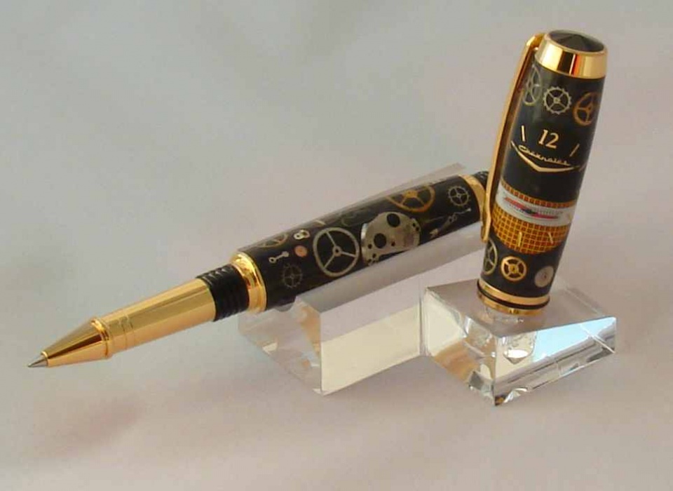 I don't post too many pens here, not because I haven't been making any, but becasue my photo skills need a lot of work. But I thought that I would go ahead and post these two. Both are watch parts on carbon fiber. The first is a Britling watch face on a Rhodium and Gold postable Jr Statesman. The second is a dial off a Chevy watch. The dial is supposed to look like the dashboard of a 57 Chevy. It is on a Gold TI Jr Gent. Both are rollerball.