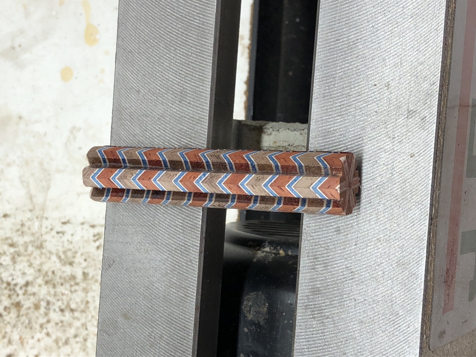 This morning I turned the blank to fit into a collet chuck, and drilled the blank. Alas, each of the joint lines between the chevrons are showing light, so the brass tube will show. I have painted the tube and will still glue it up and turn to get some hints of what I need to do to readjust my dimensions.
