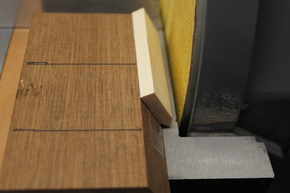 While the finial pattern was on the top, the same sanding technique should work on the side, I just needed to expand this from 1/4" long to 2 1/2" long, hopefully retaining the symmetry. I settled on constructing a basic Chevron inlay (anywhere from approximately .20"-.30" wide, 2 - 2/1/2" long. Then sanding each side to a measured point to assemble a polygon.
