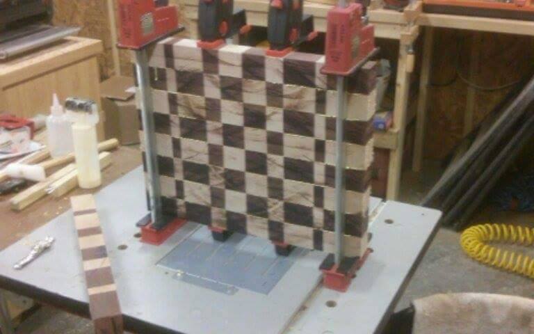 A cutting board I'm doing for a friend. Purple heart and hard maple end grain. Once the glue sets I'll scrape it all down and get it ready for the CNC. Going to inlay his business logo.