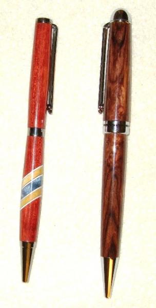 the slimline is bloodwood with yellowheart and blue curly maple segments in black titanium and the euro is cocobolo both finished with CA.
