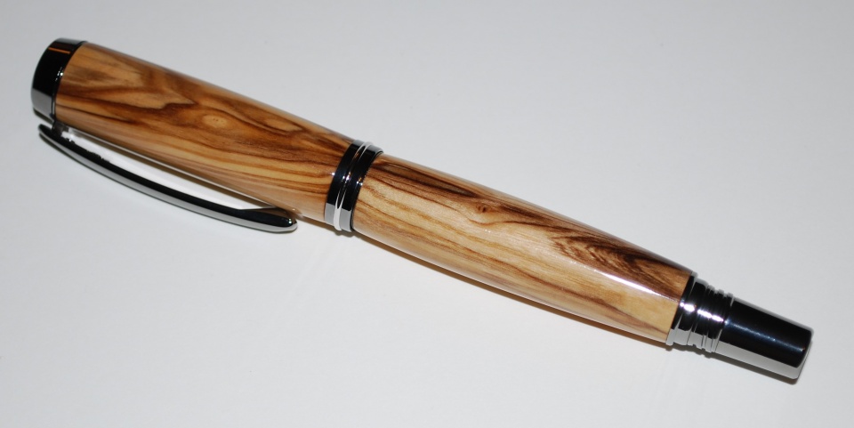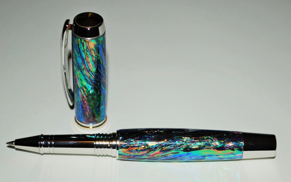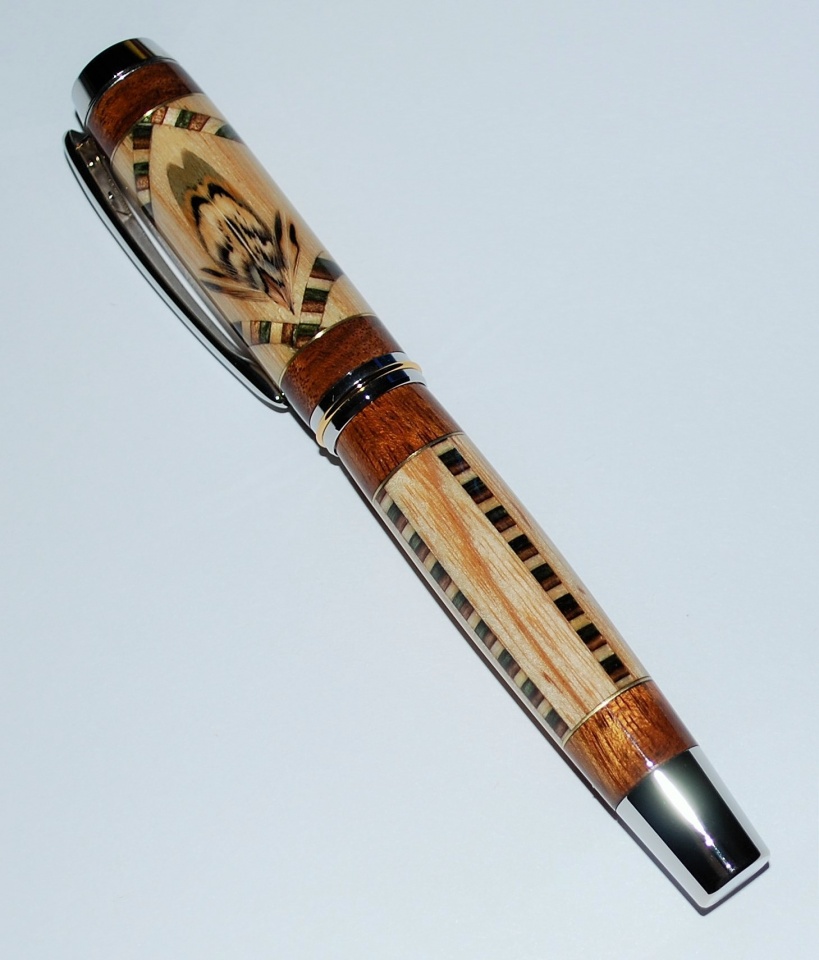The first is a segmented Chechen and Ash pen with brass inlay and a feather arrangement. I cut spectra ply to fit the inlay cuts for a little color.