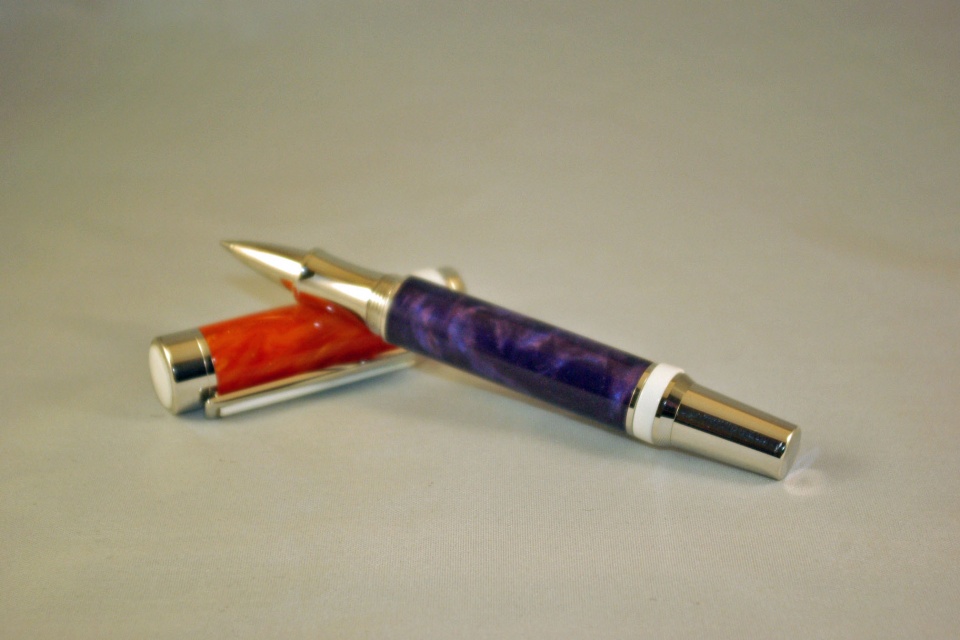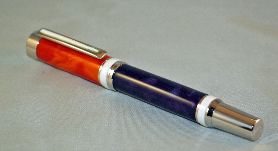 With the Carolina Clemson game coming up I decided to see what I could come up with. I got the kit from Timberbits, the orange blank from Roy, it was gifted to him from Brooks then he gifted it to me, the purple came from Rhinoplastic, the white came from exotics. originally the was going to be orange with purple accents but one of the orange tubes blew out so I had a design change. The orange was reverse panted orange and the purple was reverse painted purple.