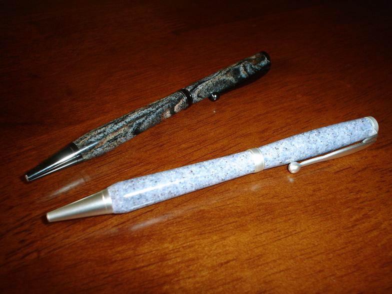 Here are a few slimlines I recently made. In the first photo, the pen at the top is made from Corian "Sorrel" (a new color for 2010), and the pen at the bottom is made from Corian "Lavender". The pen in the second photo is made from Corian "Earth". Sorry about the poor quality of the photos. I need to read the photography tips in the Library that I saw a link to in another thread, and maybe eventually get a better camera.