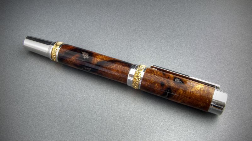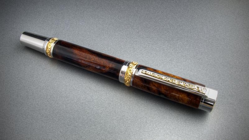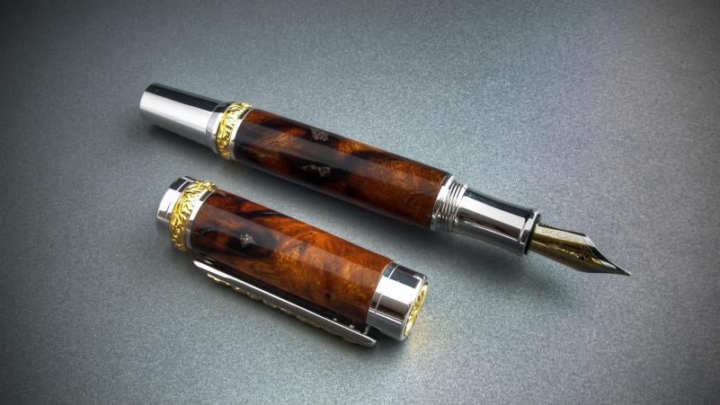 A few firsts for me. My first big fountain pen, a Roman Harvest also my first time turning between centers which i wouldn't have dream,t about doing without the info from this site, thanks all. This ones in desert ironwood with the cracks filled with steel filings and ca also finished in ca. Comments/critique welcome.