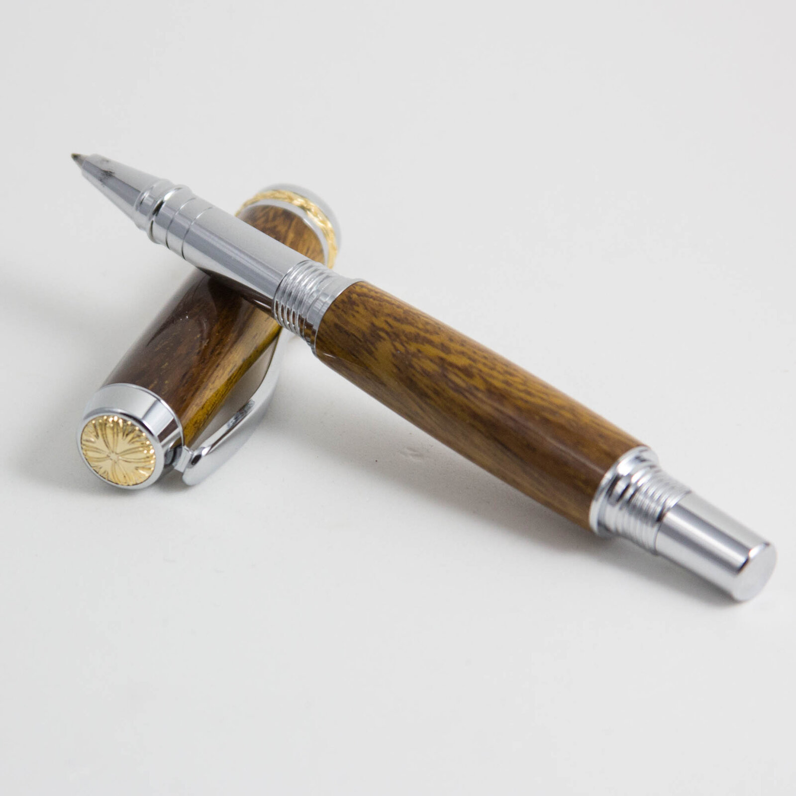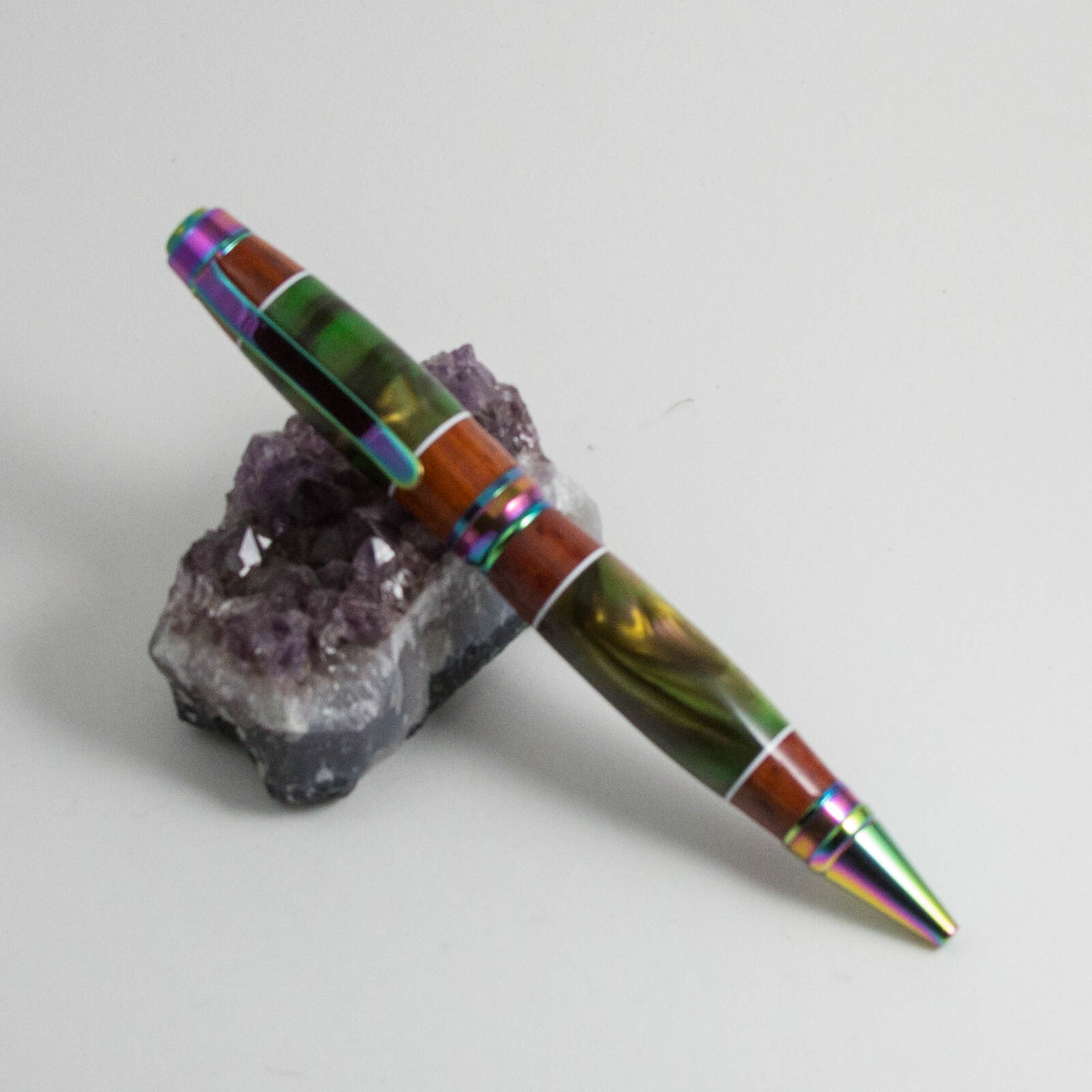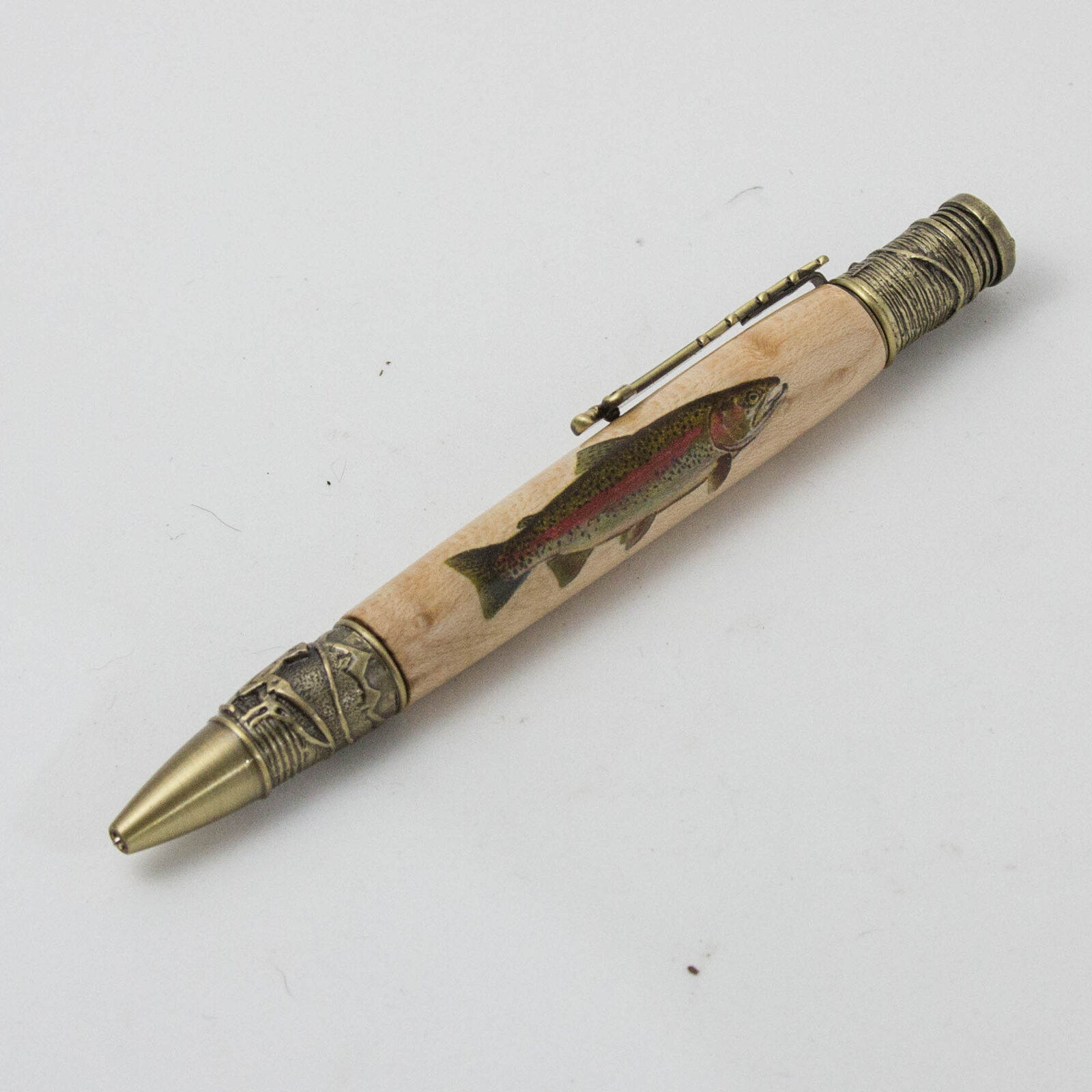 The first is a cigar with segments of Green polyester resin, Paduk, and old credit card. The second is a fly fishing pen with a Rainbow Trout on Birdseye Maple. The third is a Triton RB dressed in Pheasant Wood. C&C always welcome.