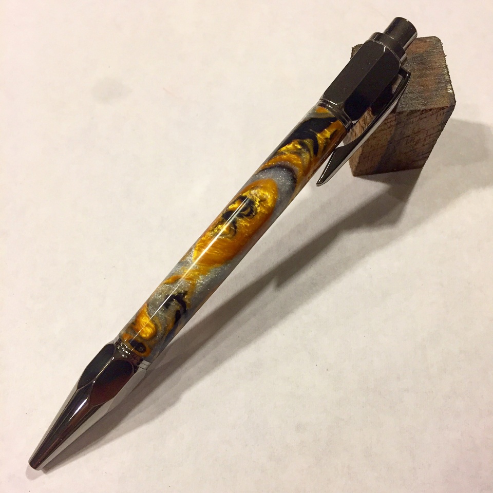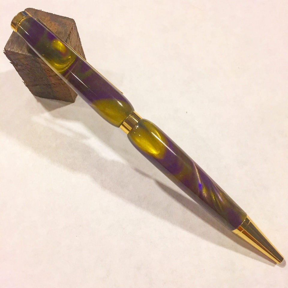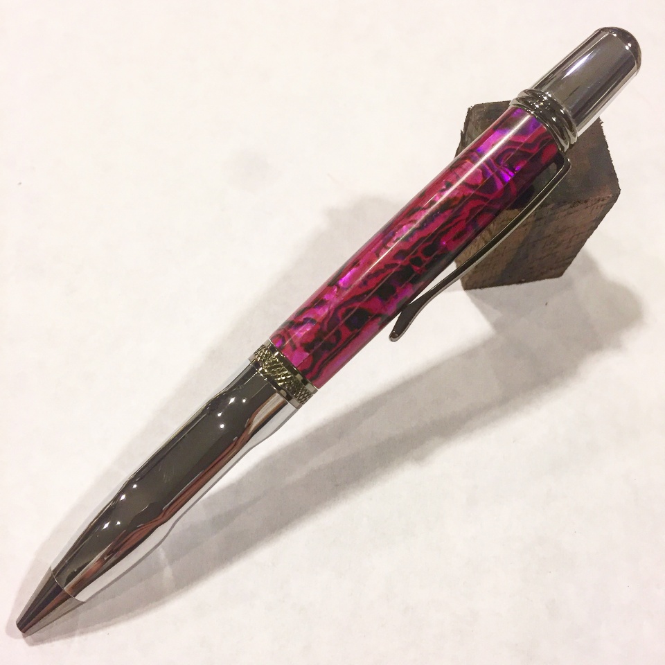 I have a gold and purple slimline, a Pink Abalone blank that I made and cast in clear Alumilite set on a Sierra Grip kit, and a Siberian Tiger Acrylic on a Vertex Click.