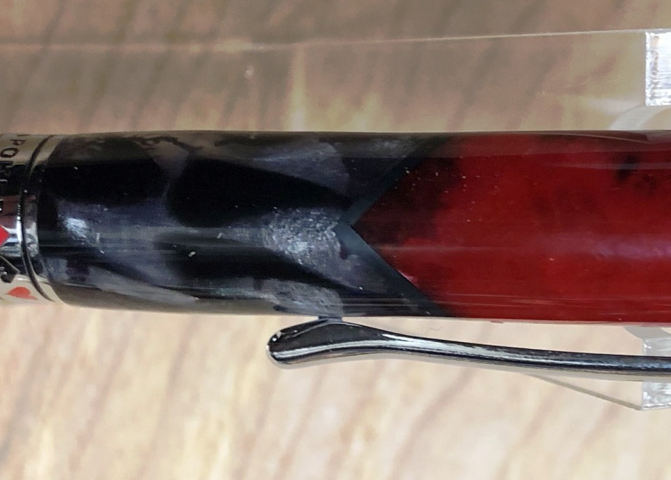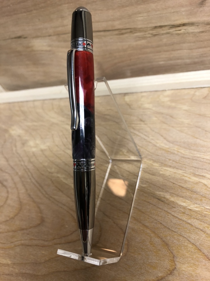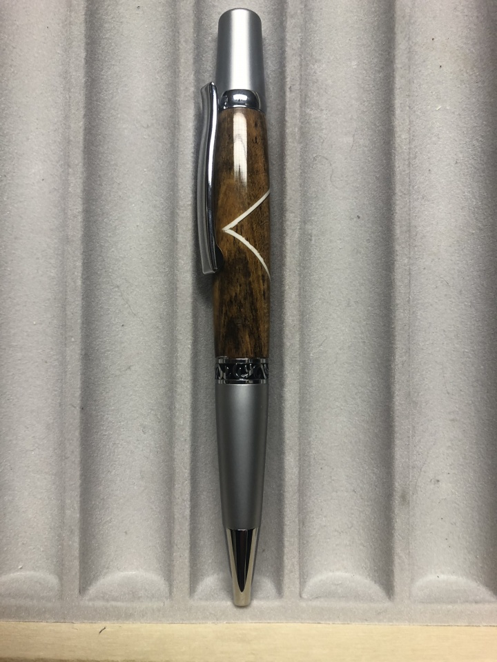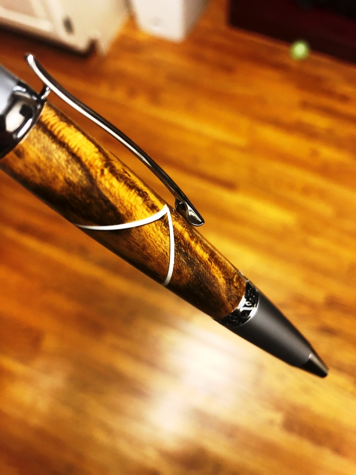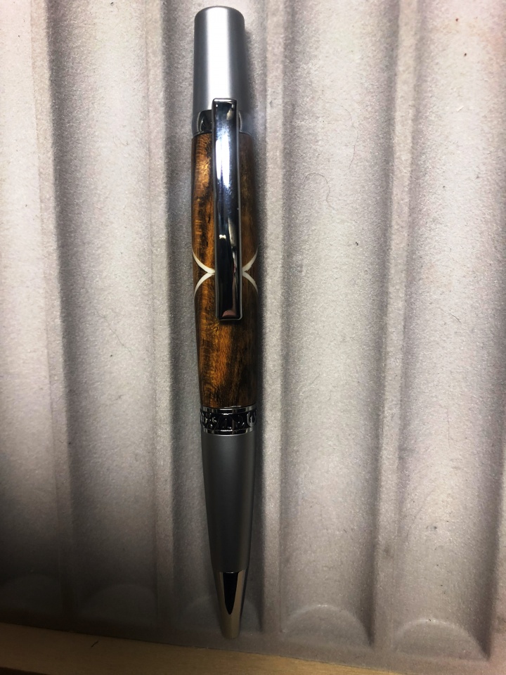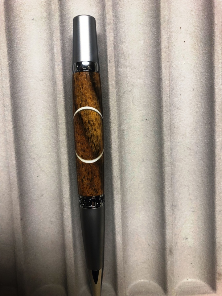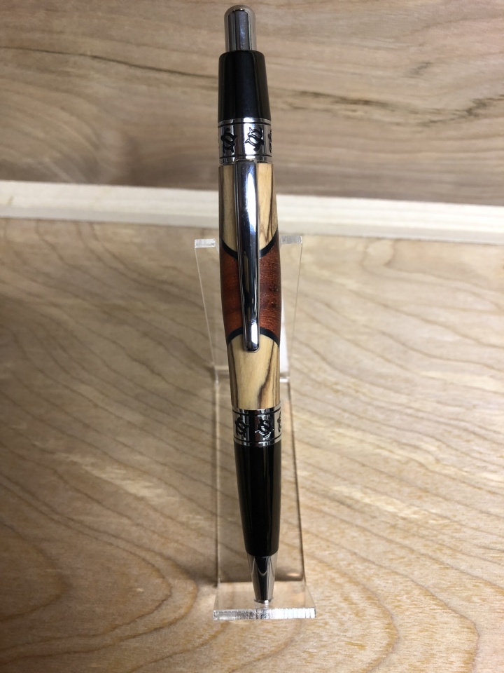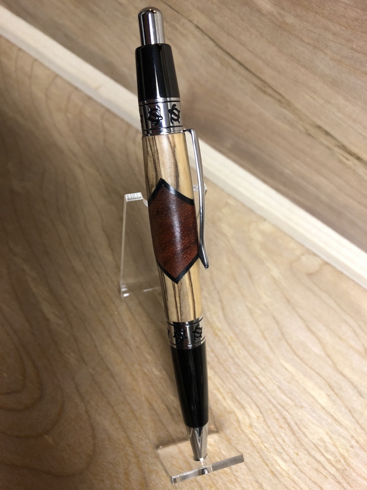 The wooden pen (Olivewood ?) using plastic gift cards. Jut cut a notch out of the side and put the plastic in and replaced the piece. Pretty simple. Not real crazy about the pattern.