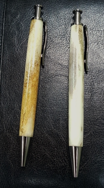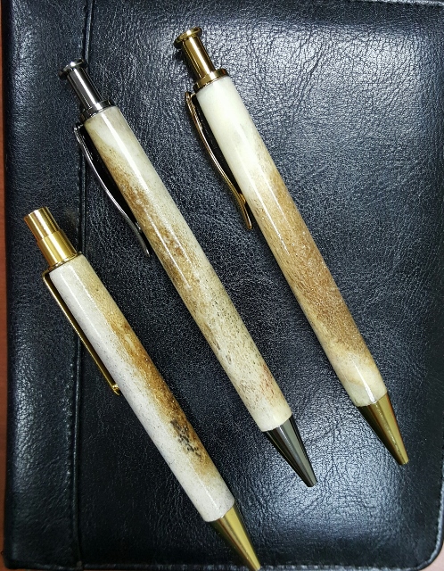 A couple of new antler pens I did for some guys at work. I've really gotten away from wood since it's South Texas and everybody loves Whitetail antlers. The one on the left has the click mechanism from Richard Greenwald, the rest are Long Clickers. The colors of the hardware were requested, so that wasn't up to me.