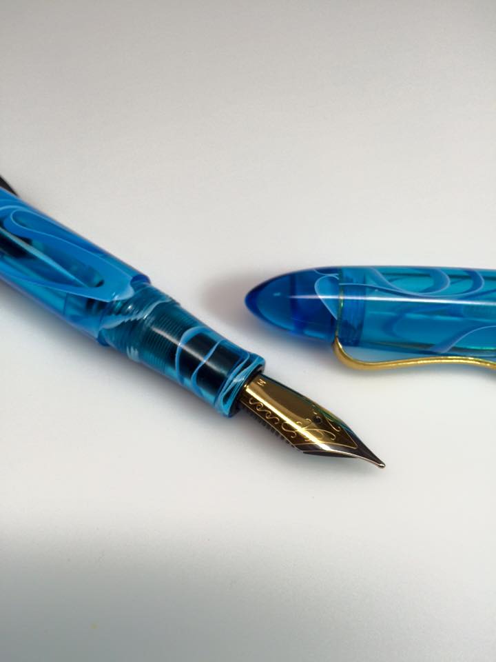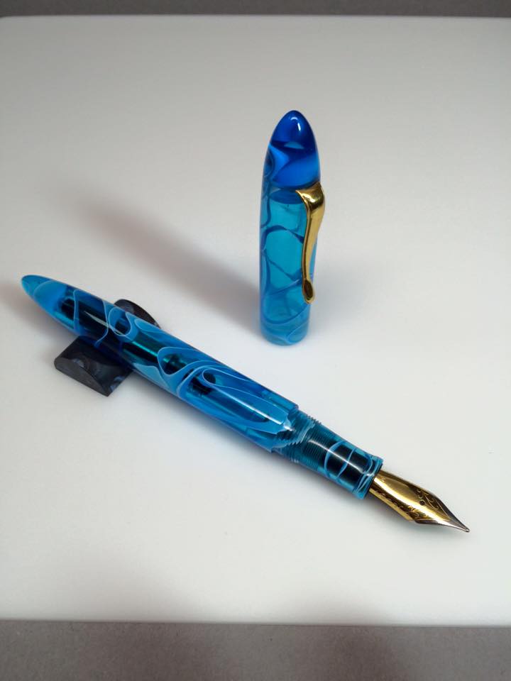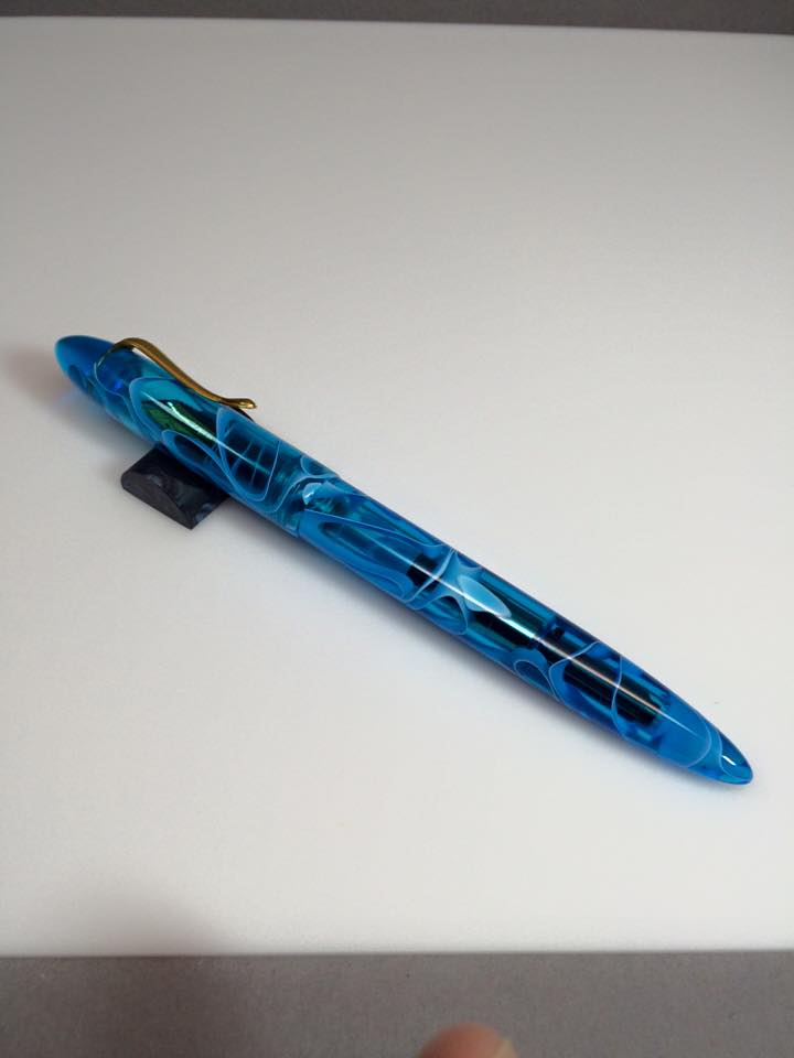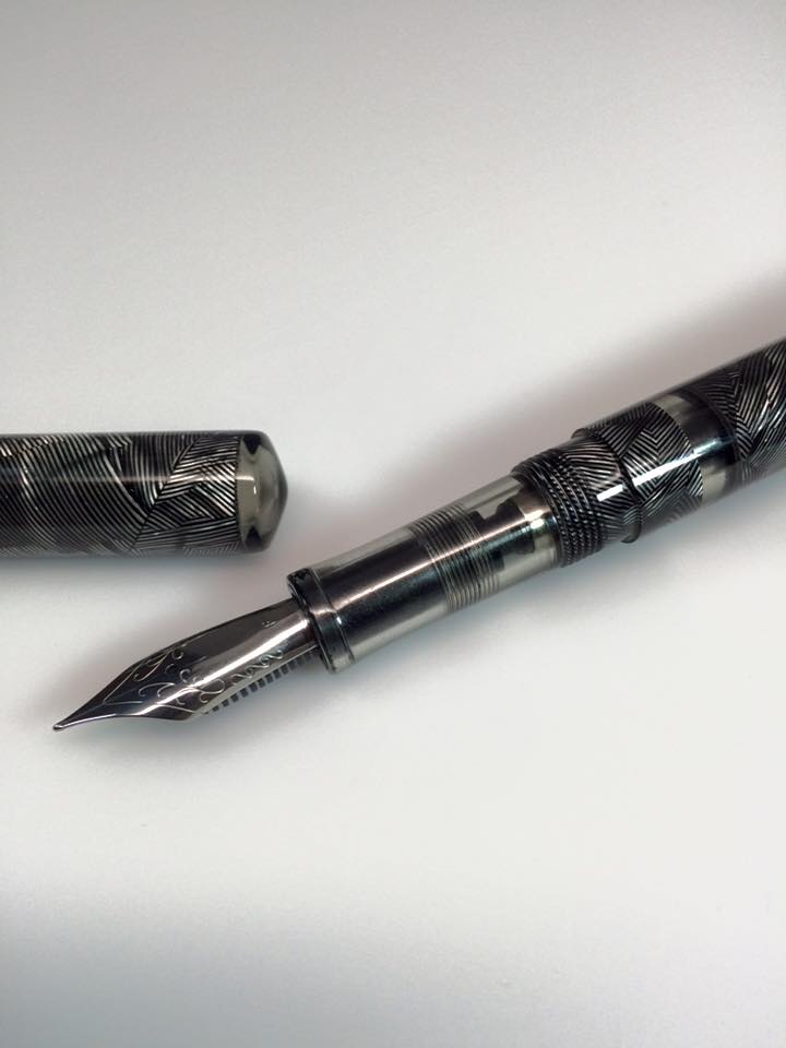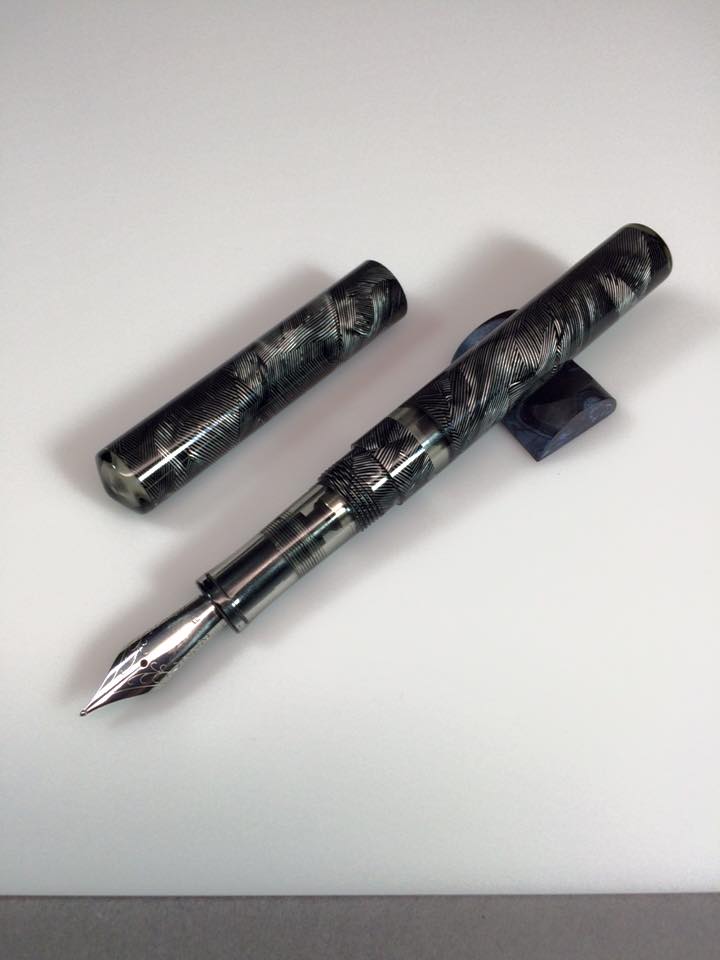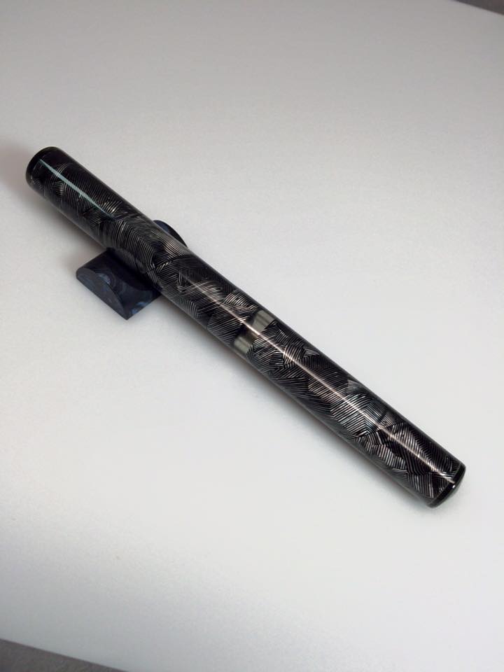 First one is the ever popular vintage gray line celluloid. This one was paired with transparent smoke gray acrylic for the ink window, front section and both finials.