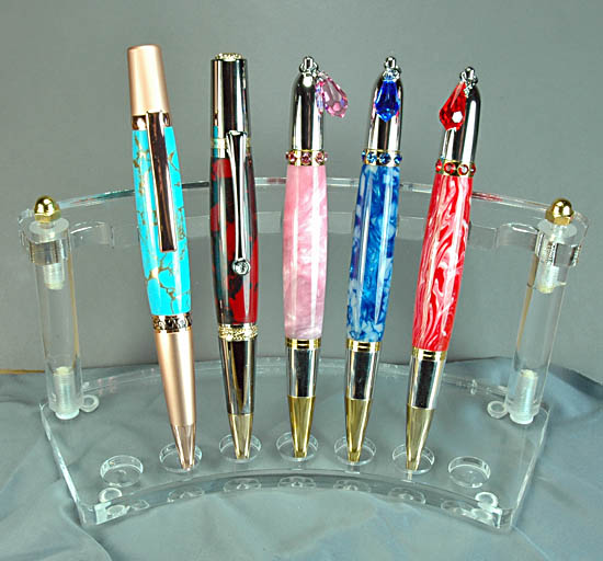 Copper Sierra EB wrapped in Turquoise with Gold Matrix Tru-Stone, Majestic Squire wrapped in Black with Red Jasper Tru-Stone and 3 Divas Cav's Uni Pink, Blue Ice Acrylic and Red-White Spiney Tru-Stone.