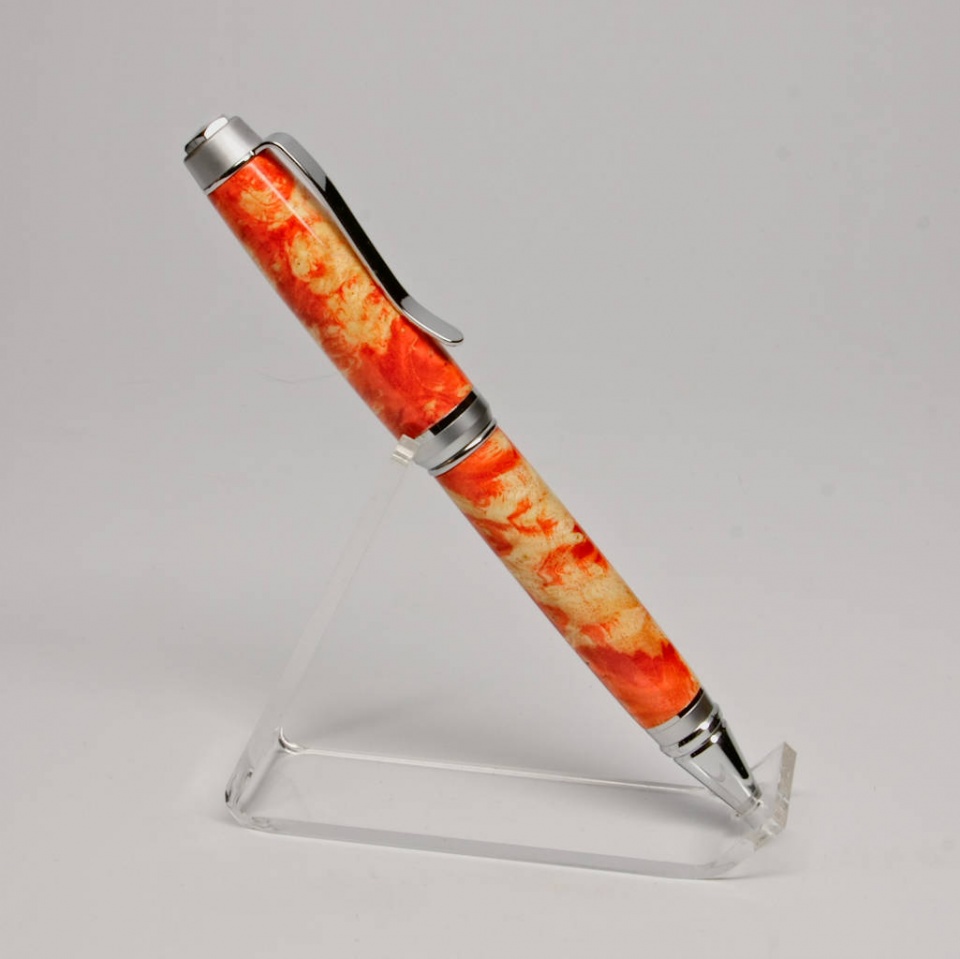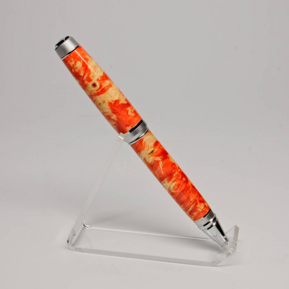 The orange one is box elder burl and was an early dye where the blank was pulled before it got 100% saturation into the wood. I actually like the outcome of this one with the mix of colors.