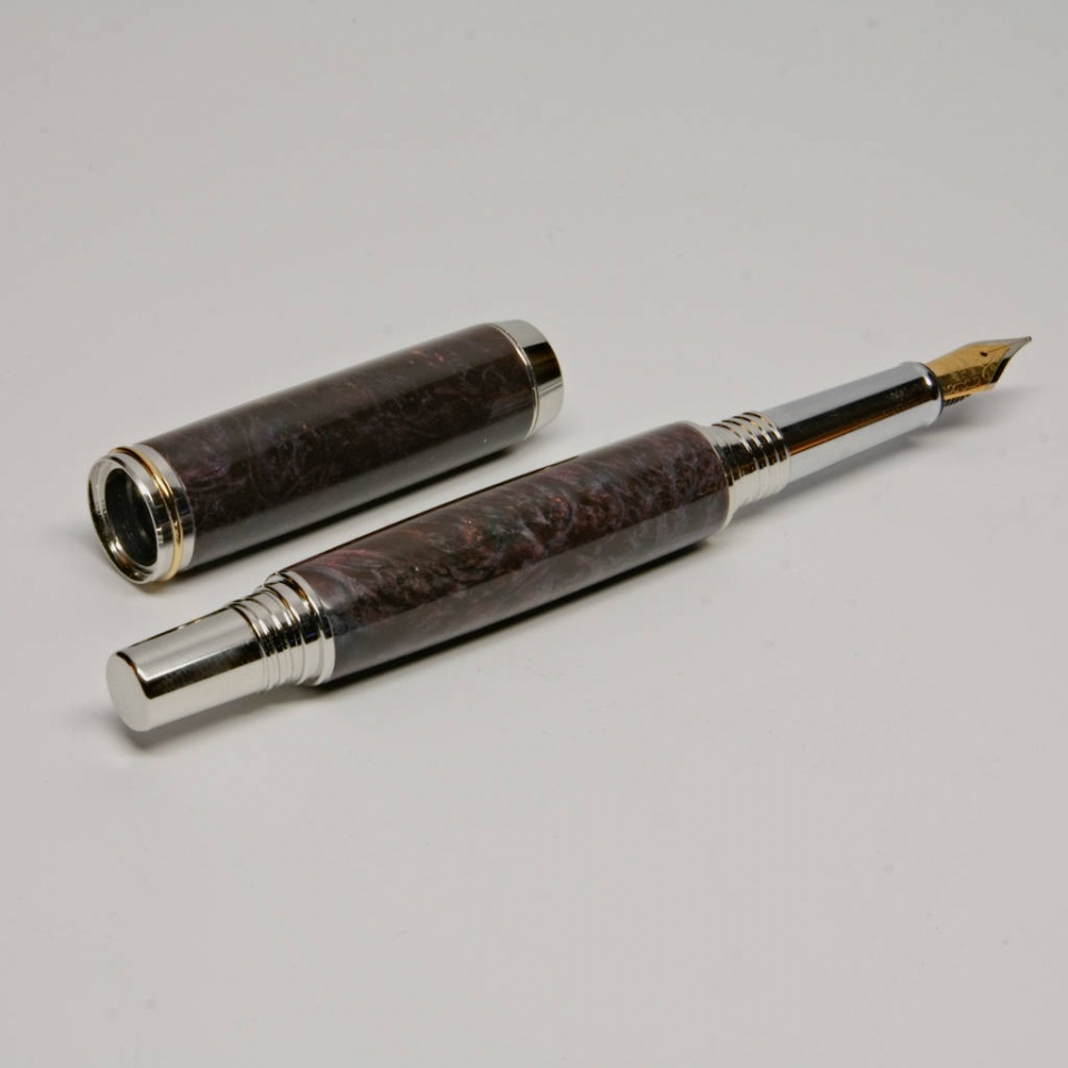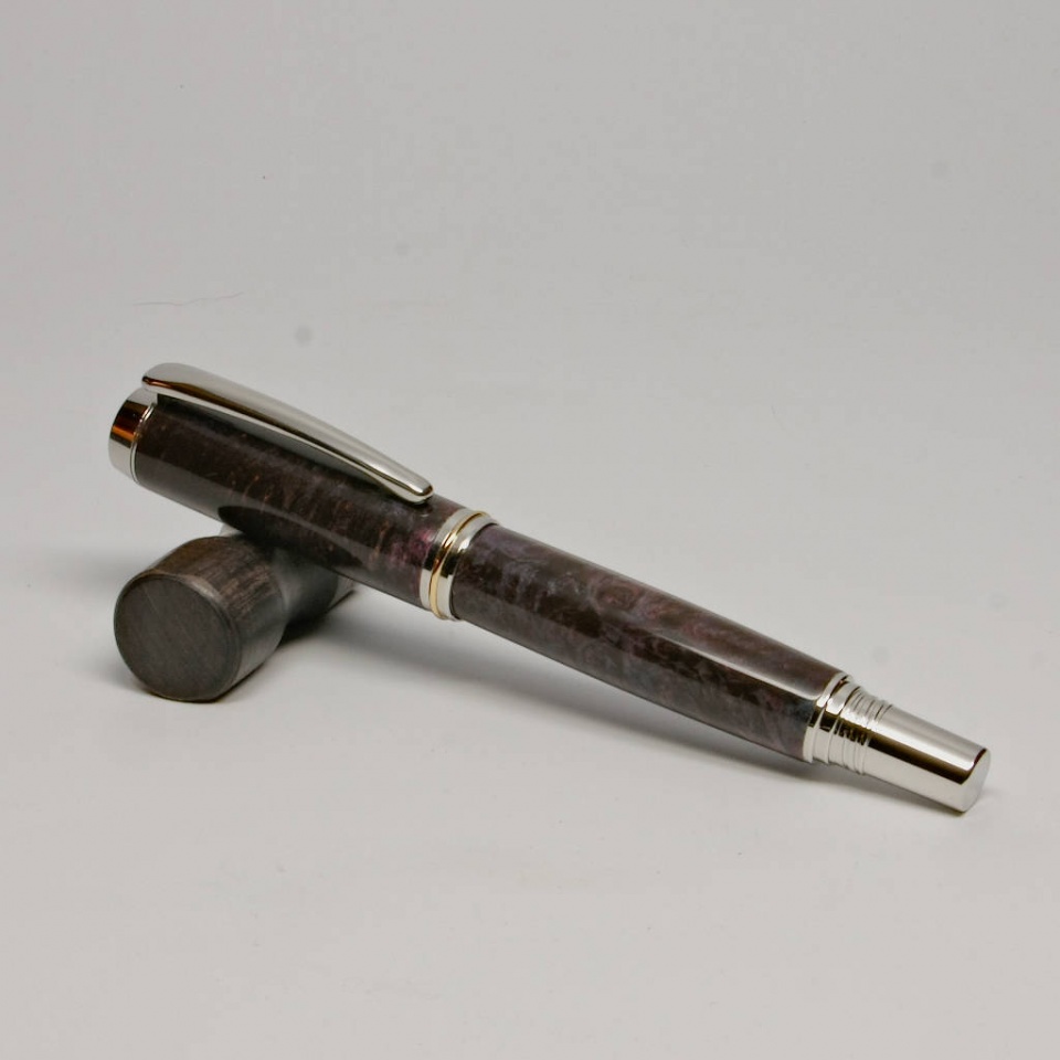 The fountain is an interesting outcome. The blank itself is buckeye burl and was a very vibrant purple with full 100% saturation of the dye. Once it was turned and sanded, a CA finish immediately turned it much darker to almost a charcoal with a purple-ish tint to it. I think next time I'm going to try a lacquer finish to see if I can keep the purple in tact. I like the final result of this one, just different than I expected.