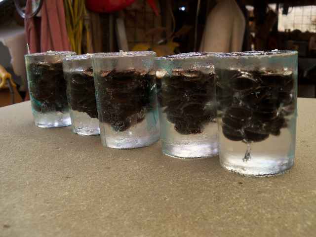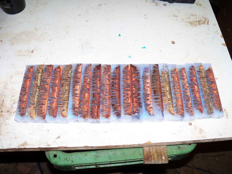 The first step is to get the molds off the pressure pot and put them in the sun to dry, then in the afternoon the serious work commences, the molds are dismantled, the blocks are sliced into pen blanks, and before the day is over, I have to have one of those blanks (totally random, as most times you can't see what is inside until it is polished and coated with some sort of liquid), turned and CA finished...!:wink::biggrin: