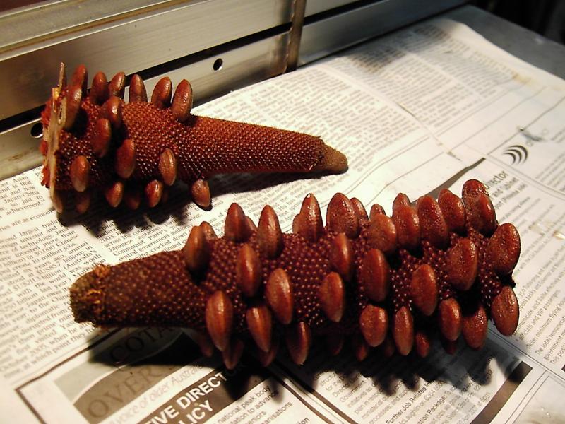 Looking closer at the seeds, they are probably responsible for this the problems as the outer surface is very hard, not allowing much if any penetration of resin and are, very glossy/slippery type. I still thing that the hardener % I used have something to do with it, as I believe that, for some reason the 2.5% used was too much here, or for whatever reason the resin did set too fast (even though it took forever to start gelling...!), or something else happens that created too much heat and the resin shrunk/lost volume as it cured as, I felt that the resin was a lot more brittle than normal and that is not a good sign and results wanted/needed with type castings.