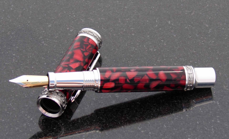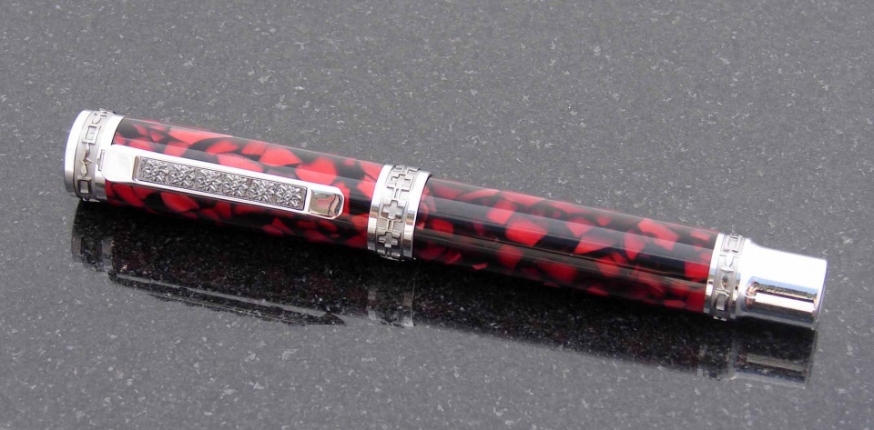 The last is an Emperor Fountian Pen in Rhodium/Black Titanium. The nib is upgraded to a fine Heritance nib. The body is black and red Ceboplast.