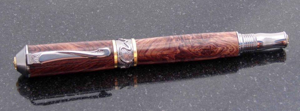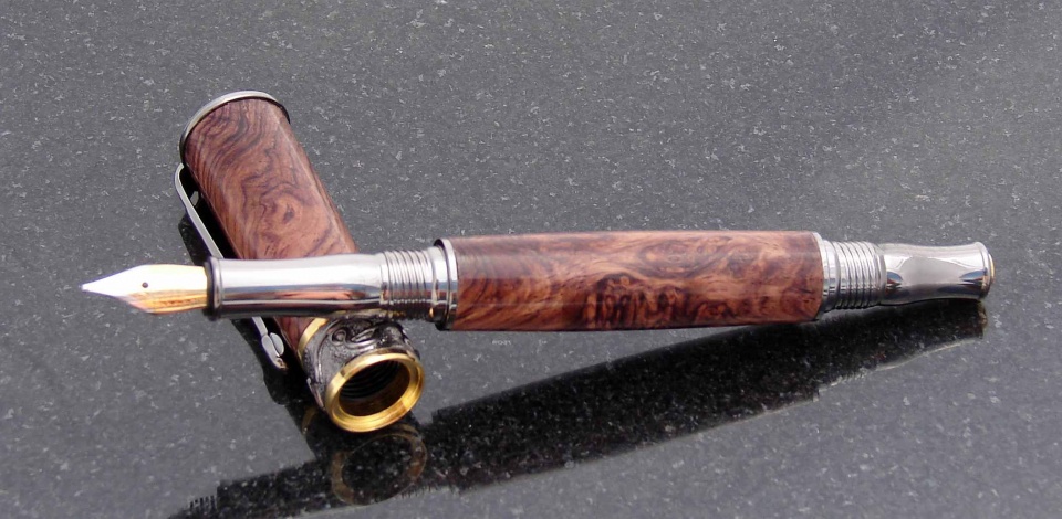 The first is a PSI Broadwell Nouveau Sceptre fountain in Black TN and 22k gold, the wood is an unknown burl that looks like a rosewood. It is finished in CA.