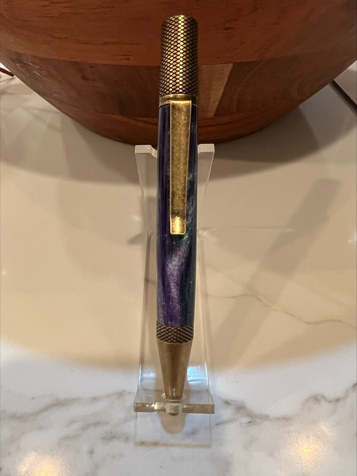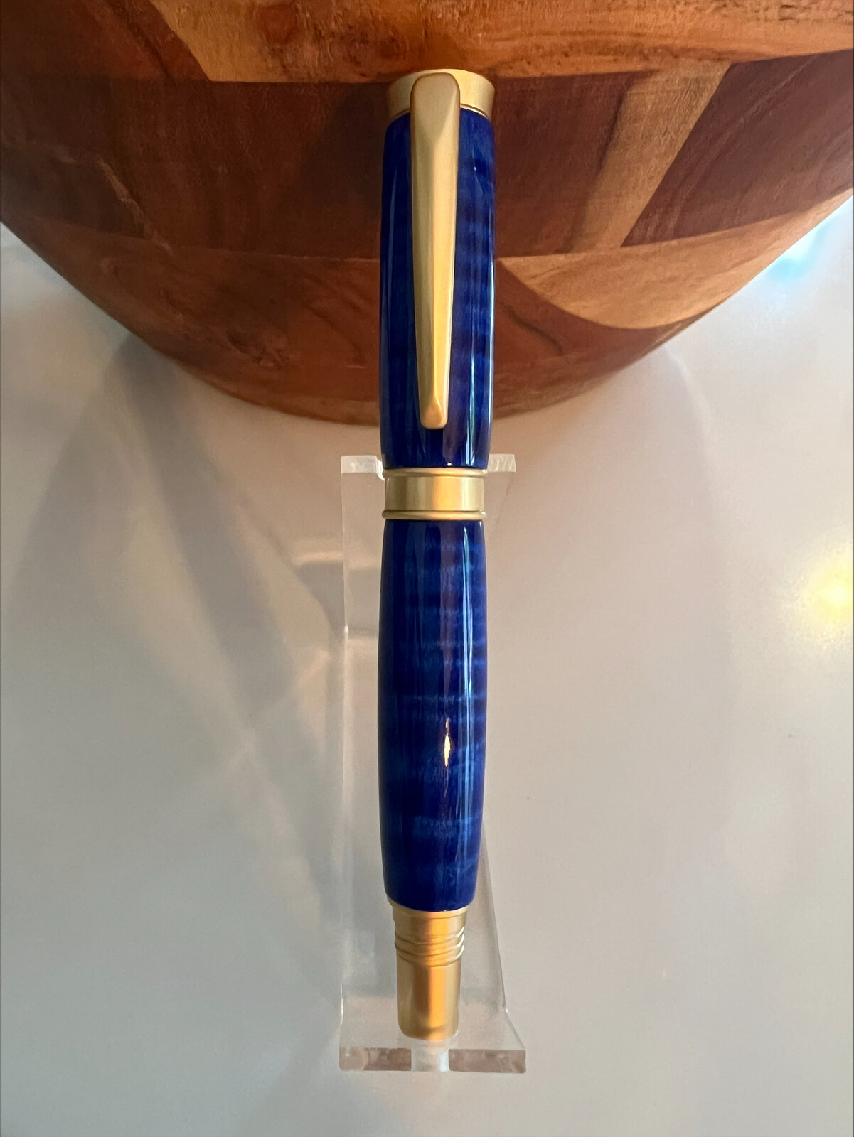 The wooden ones are curly maple dyed with Transtint. The other is Rhinoplatic.