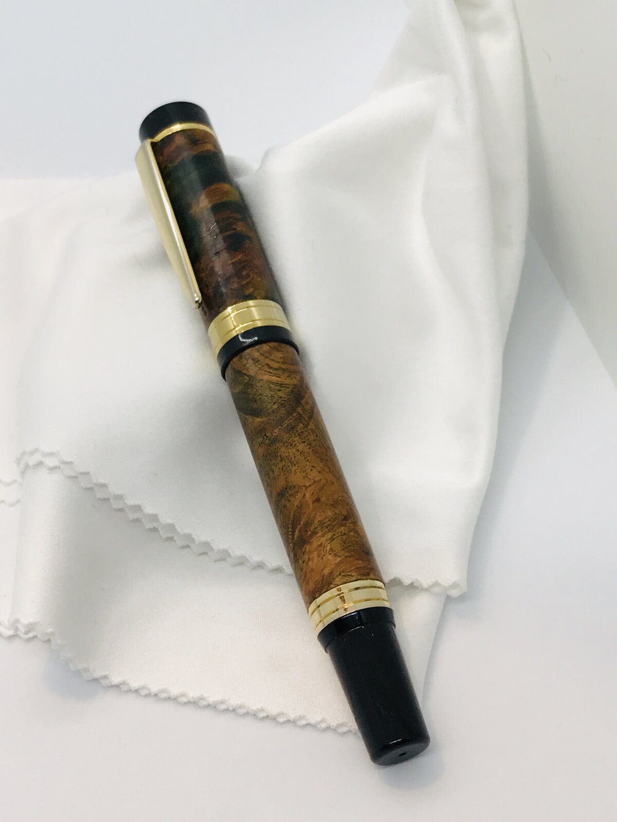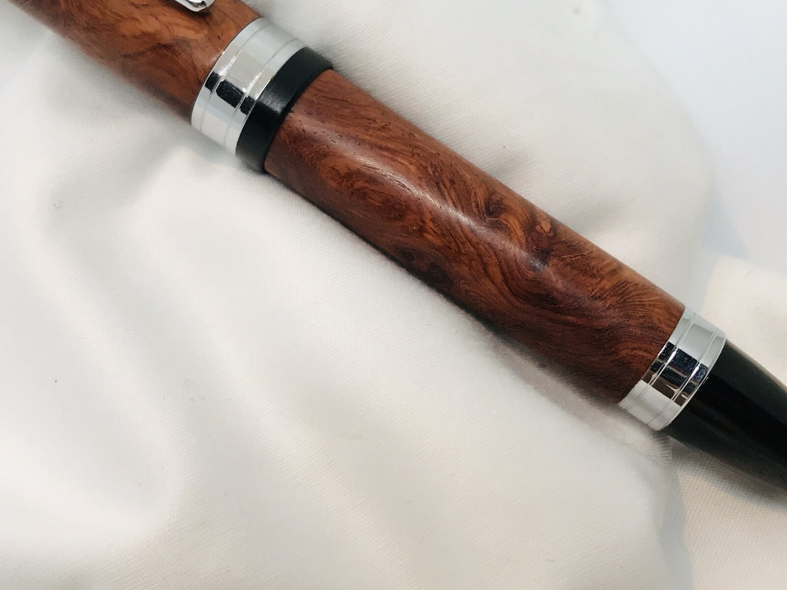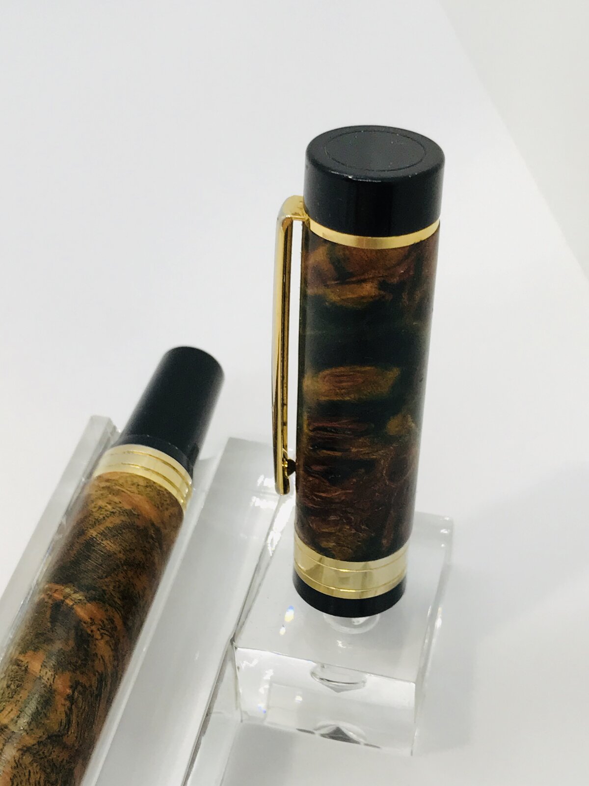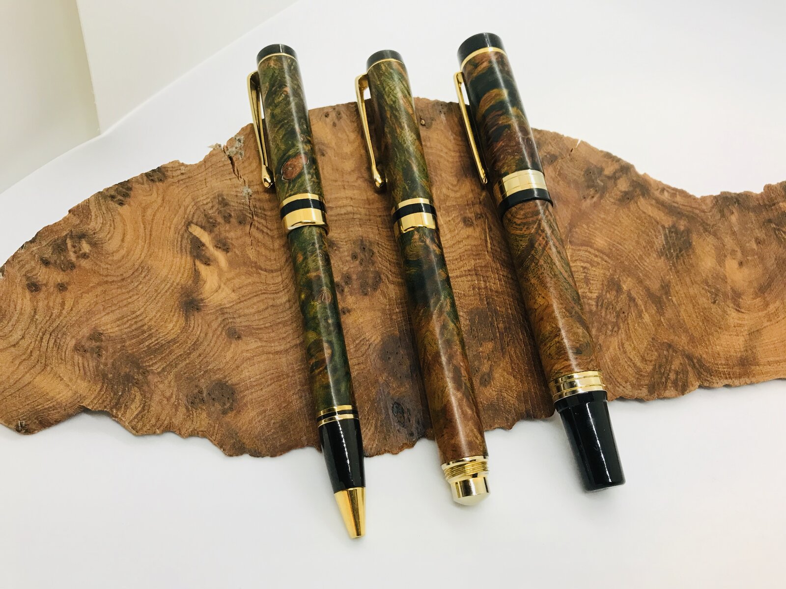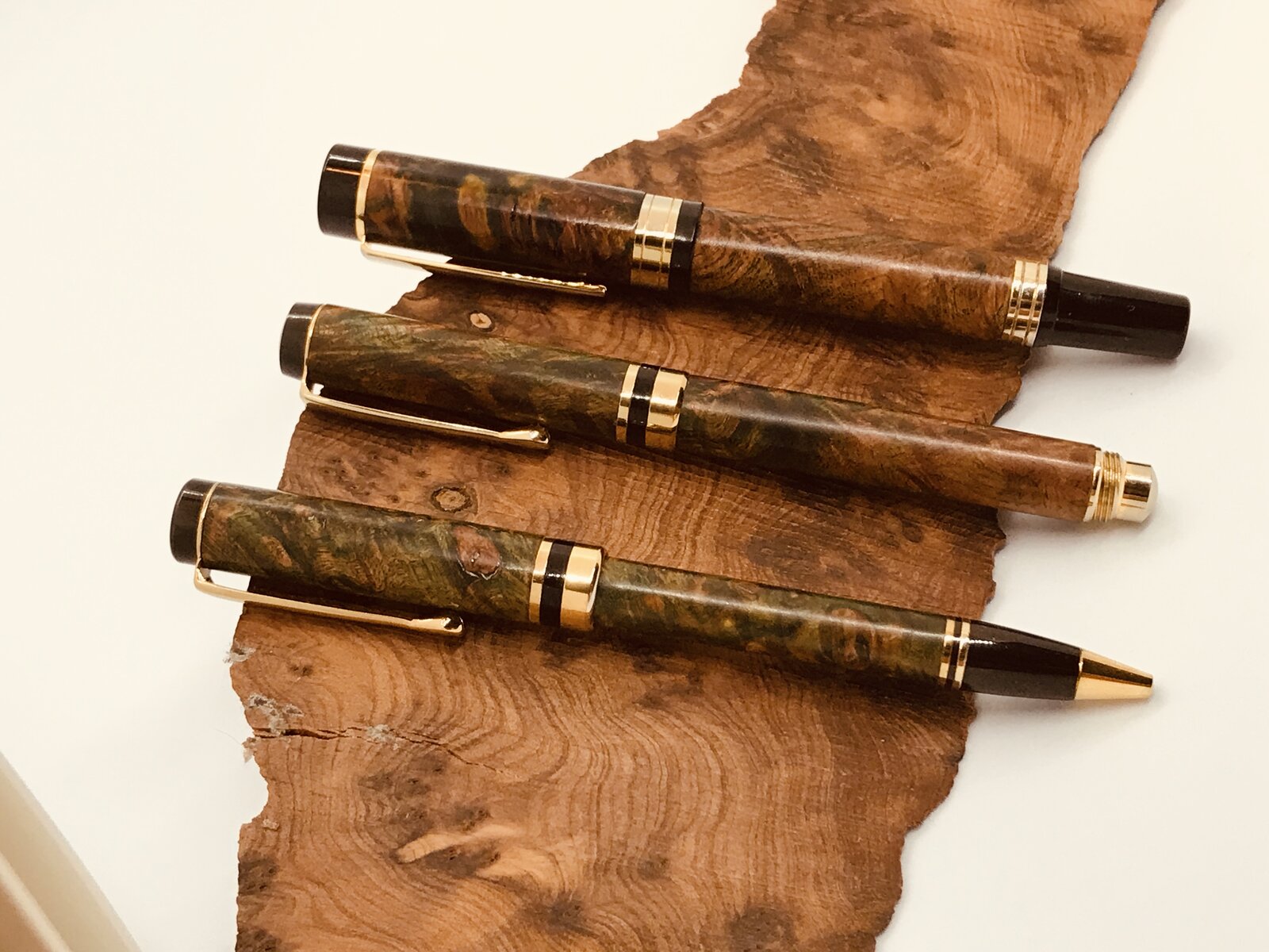 These are some El Grande kits I had lying around. The 1st 4 are Ti Gold with some nice natural Buckeye Burl. The next 3 are Ti Gold with green-dyed Boxelder Burl. The next 2 are an experiment with photography - I'm not a photographer. I have 3 different pens all in green-dyed Boxelder Burl: an American Double Twist, a Streamline American Screw Cap and the El Grande from the 3 previous pics. The last group of 4 is probably my most favorite kit in one of my most favorite woods: El Grande convertible pencil/ballpoint in Platinum; the wood is some very old (> 15 years old) figured African Rosewood. Please let me know what you think - bad and good.