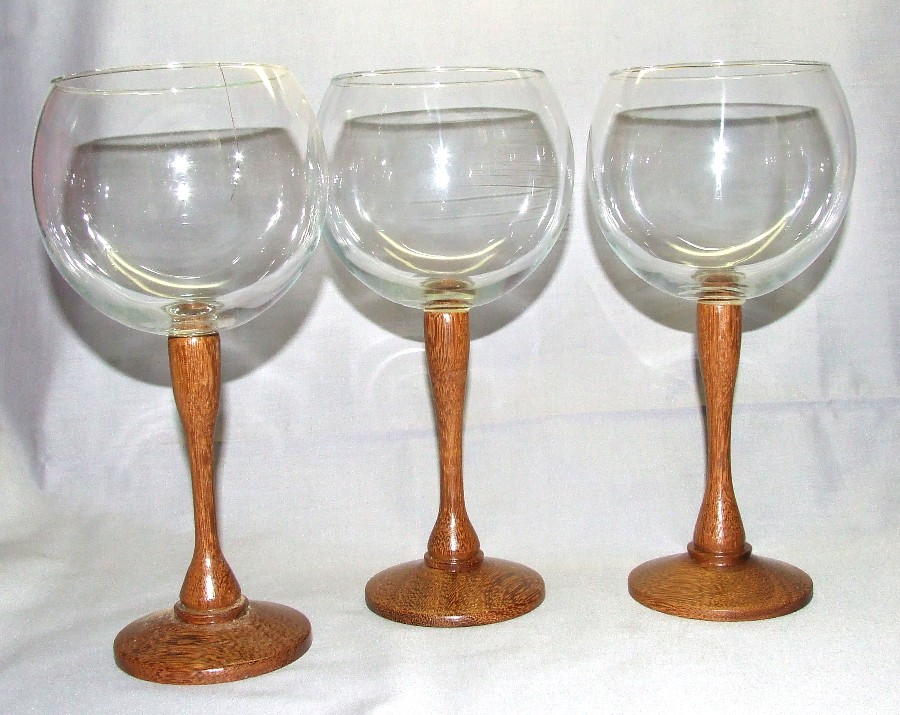 The wine glasses are replacements for a customer that bought a set last summer... last day of the market she brought two of them back that they had broken and asked if I could repair them... no way to get the glass out of the stem, so I made two new goblets. The one on the left is one of the originals that has a crack in the glass... the two on the right are the replacements.