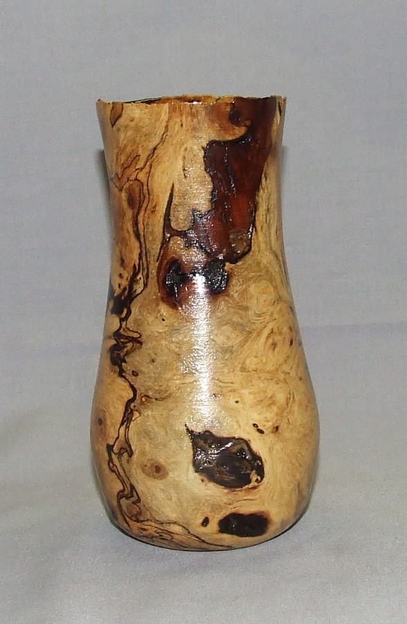 The little oak vase is a piece of oak burl that a customer gave me... he stopped by early last summer and said he had a pile of burls, he didn't know what they were, but I was welcome to them.. turned out to be oak burls and most are small, baseball size up to about 7 or 8 inches dia... this was one of the mid sized one...has lots of bark inclusion, it's 6" high x 3" at the widest part... I left the lip a natural edge.