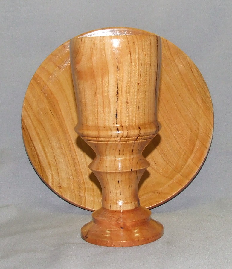 The chalice and paten is from cherry wood, the chalice is 7 1/2 tall x 3" dia ... the paten is 8 inches dia x 1 inch high.