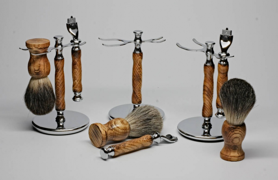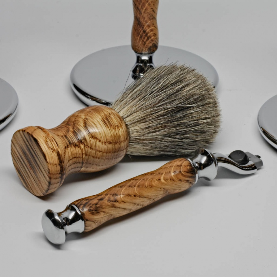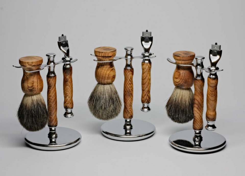 Finished in tru-oil with a wax top coat. The staves were cut at a 30-degree angle to get the rays of the white oak and burned in the grain to finish it off.