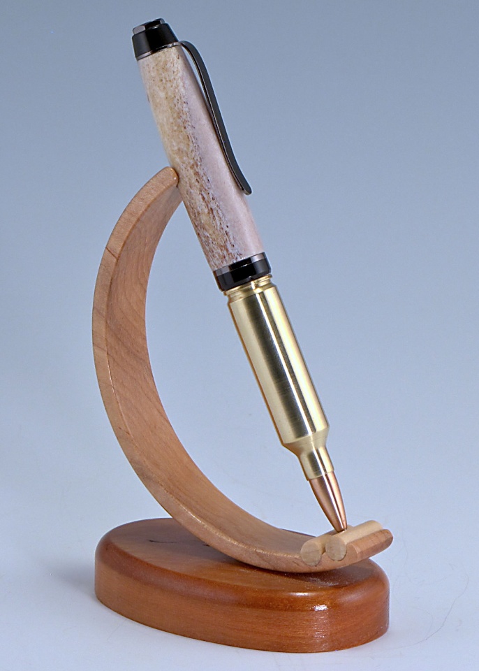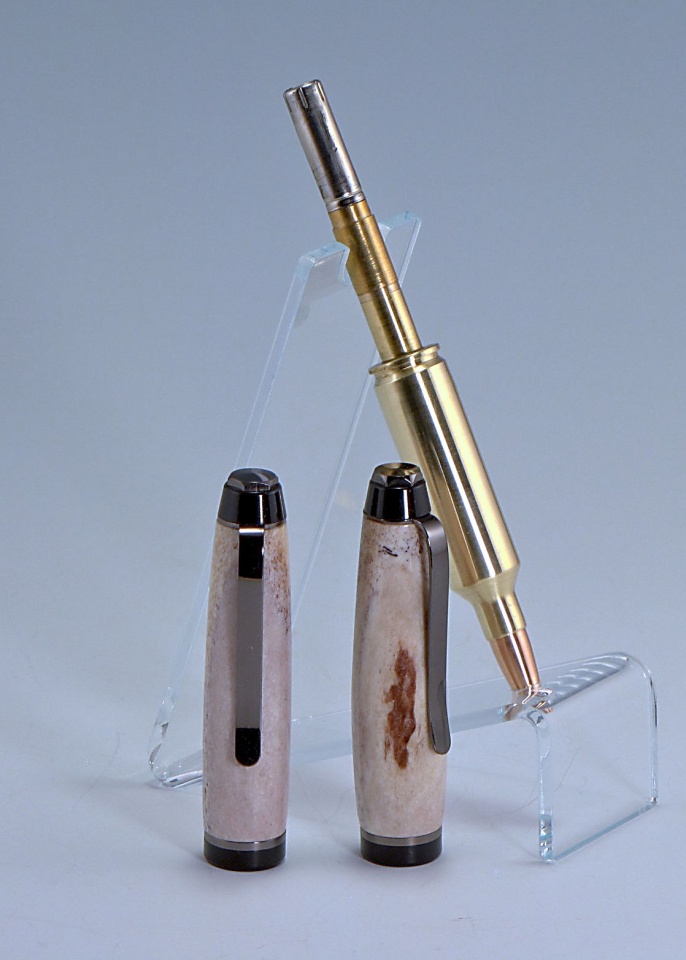 The cartridge is dressed in deer antler with gun-metal finished cigar hardware with black spacers. The bullet is a 155 grain match grade FMJ with boat tail. The pen uses a Parker style refill in medium point black.