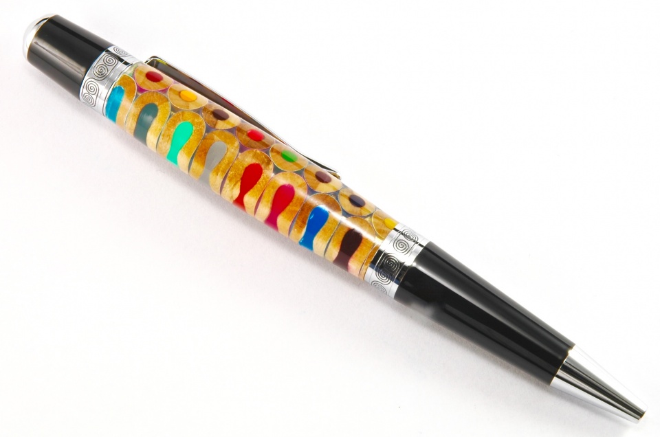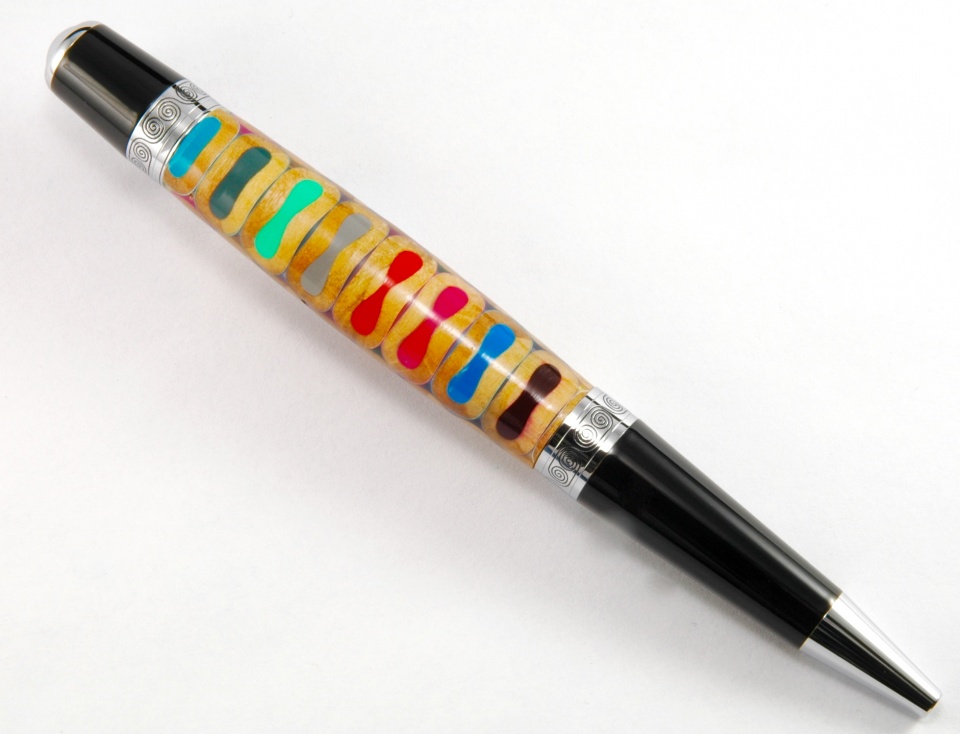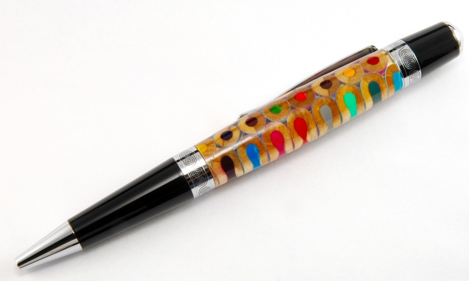 I was just goofing around with some ideas and this was one of them; I cast a box of colored pencils in Alumilite and created more work than it was worth! Mind you, the pencils were not stabilized. The further into the blank I went, the more the pencil leads wanted to separate via centrifugal force. I used a few layers of CA, cut some more, added more CA, cut some more, and so on. It took forever to turn!