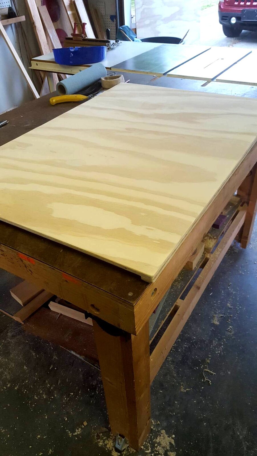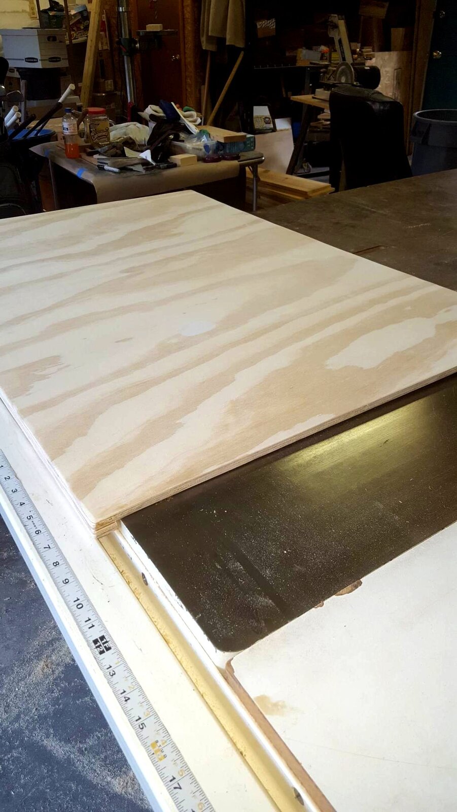 The 20-year-old protection top for my table saw was biting the dust. So I decided a new one is in order. I'm going to stain it in Gun Stock since I have some left over from the shelves.
