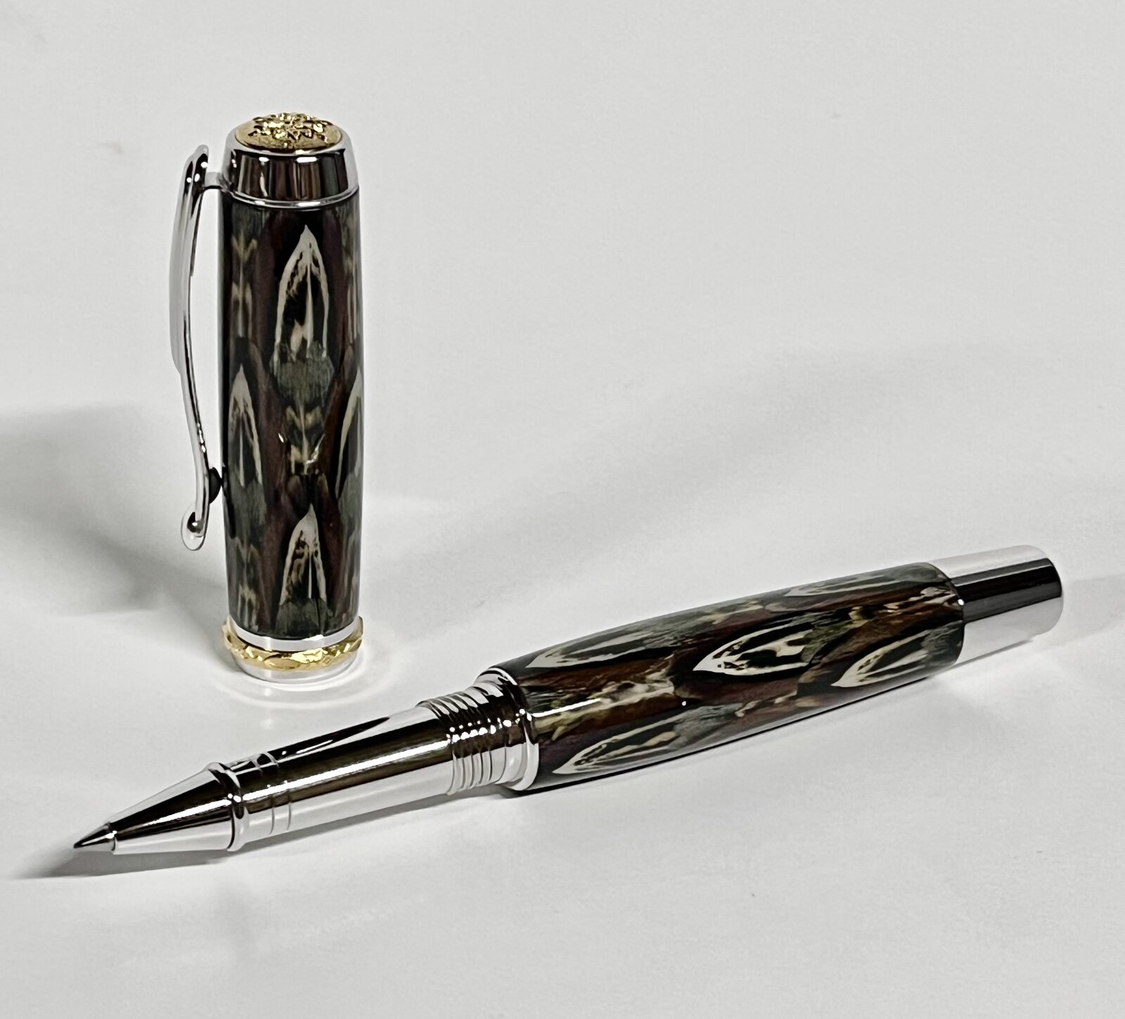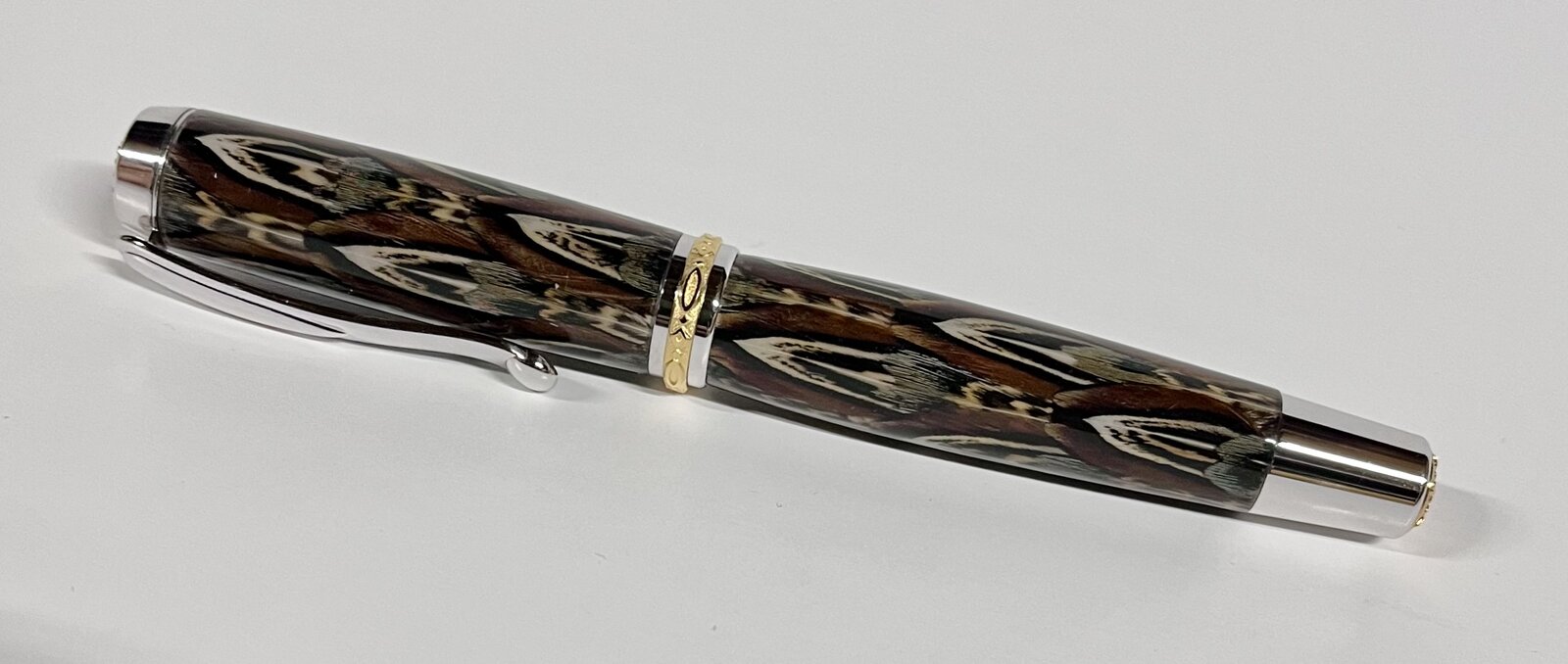 I don't get to turn a lot of these so I thought I would share. It's a Jr Statesman with a ringneck pheasant blank. I set these tubes aside during the making of the last group of feather blanks. It's a gift for a friend I used to work with who got himself a new office. I thought it was only fitting to have a new desk pen for his new desk.