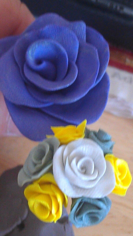 Roses are easy...just a piece of clay flattened into a sort of tear drop shape and rolled up with the narrow part at the bottom...then a series od slightly larger pieces of clay warped around the first in an alternating patern. Only too me a few minutes so practice