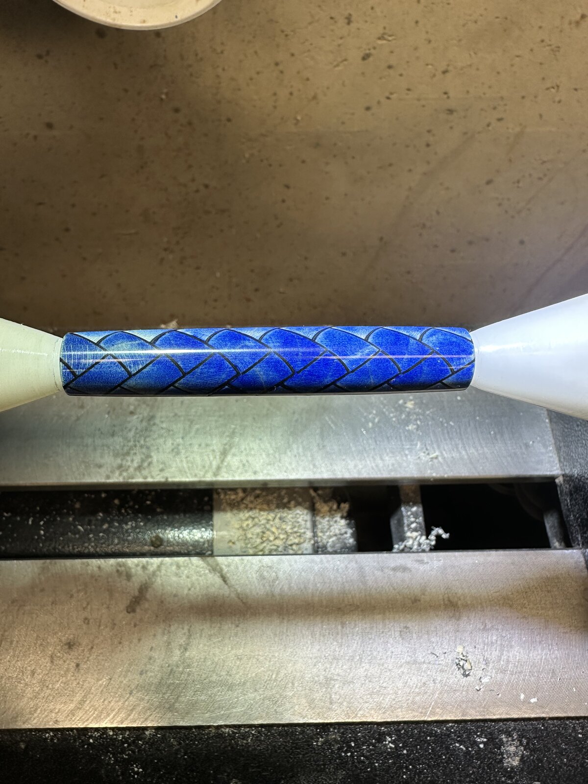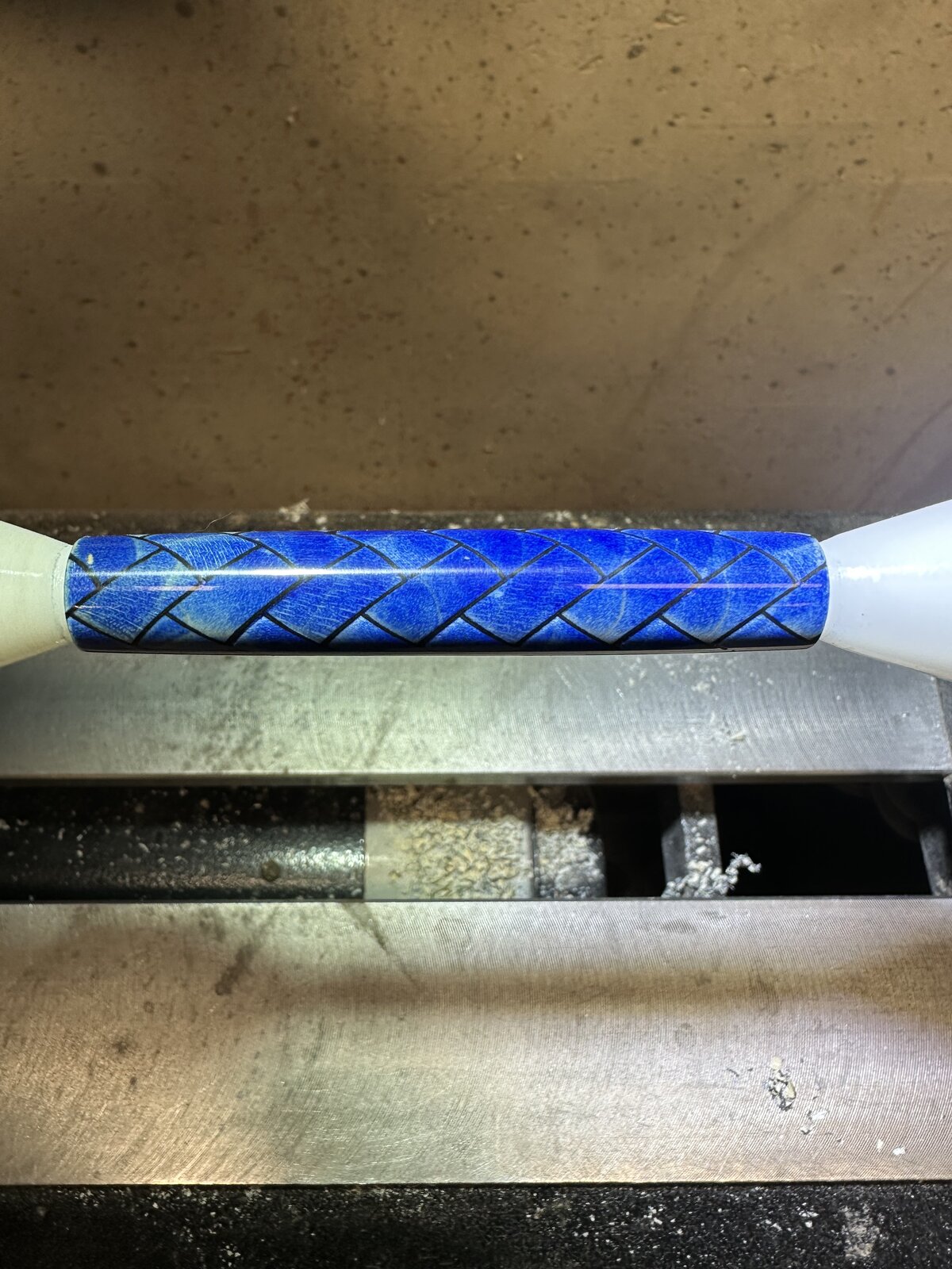 This one was an experiment from the get go. Personally, I don't like the result and it won't be made into a pen. We all know end grain can be difficult when it comes to stain. Before I turned it to final size, I applied sanding sealer to the left side and nothing on the right side and then applied blue dye. The right side looked better so that's what I went with. Probably this would work if I had made the blank with the side grain supposed to end grain. It's not a failure because it was a learning experience from the beginning.