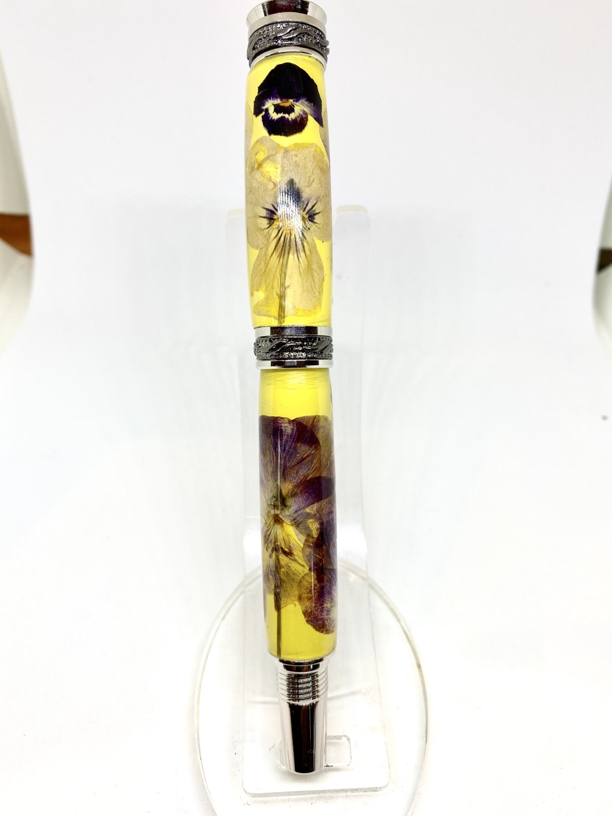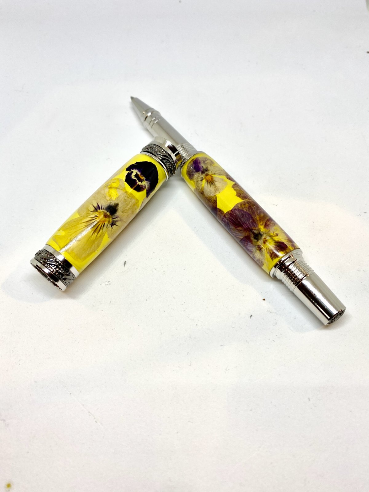 I bought this Marla Christensen Canadian Pansies blank set from Classic Nib eons ago - before Nils and Debbie took over. It has real pansies affixed to a painted tube and cast in PR, IIRC. It sat in my To-Do drawer for years as I did not have the guts to turn it at the time with the meager tools and skills I had then. Forgot all about it until yesterday when a need arose. I paired it with a Rhodium and Black Ti Majestic Jr. kit. It will be the main prize tonight in the raffle drawing for our local woodtuening club (Waxhaw Woodturners). C&C welcome.