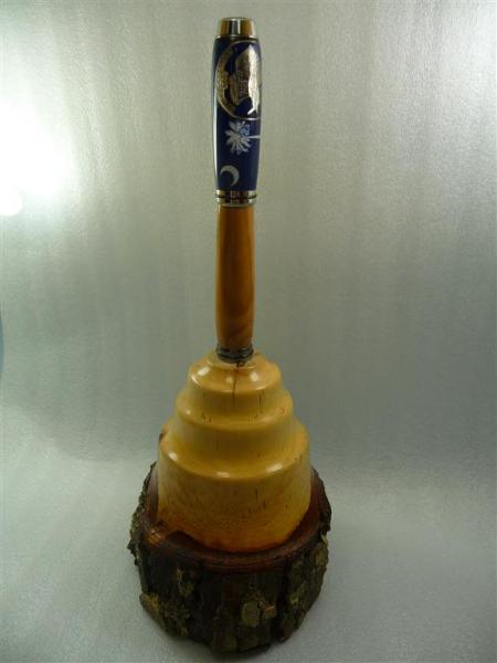 The base is a second Cap - Desk Base – It will hold the pen as a presentation piece and or as functional desk pen. I shaped the base to show as much of the natural bark from the wood as I could. I did soak the bark with some thin CA in areas that were loose in order to keep it from falling apart. The mossy looking coating on the bark is called lichen – it is a harmless fungus type "stuff" that seems to take over many of the Dogwood trees.