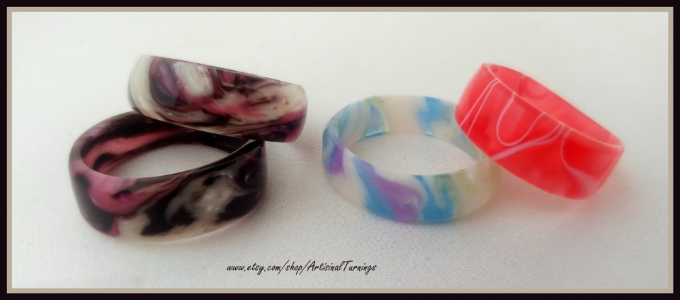 Nice work as usual. I've been thinking of doing the same thing for a long time, but in the end I'd just have some plastic rings. Please don't take that as a knock, you did a fine job, but I just didn't see a market for them even as gifts, especially given the time involved making them. I then thought of making child sized rings to give to kids, but you've got the liability of it being a choking hazard, and justifiably so. Like you, I still have a large assortment waiting for something to be done with them. Let me know if you come up with any ideas. All I can think of is recasting them in resin, which I've done before (after busting them into pieces) with a shaving brush that actually turned out pretty sweet. Maybe using them for small inlays or knobs on little acrylic boxes?