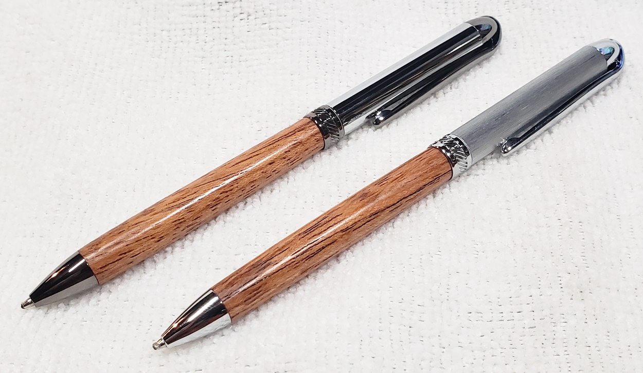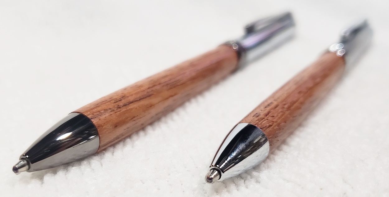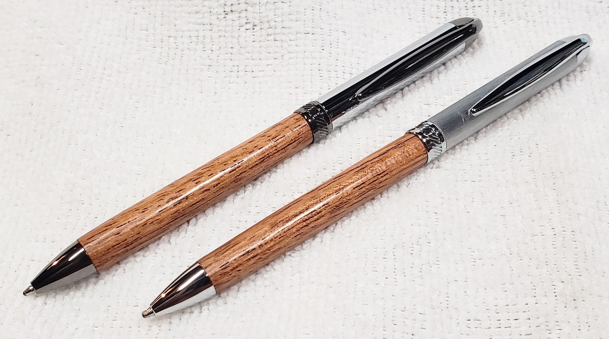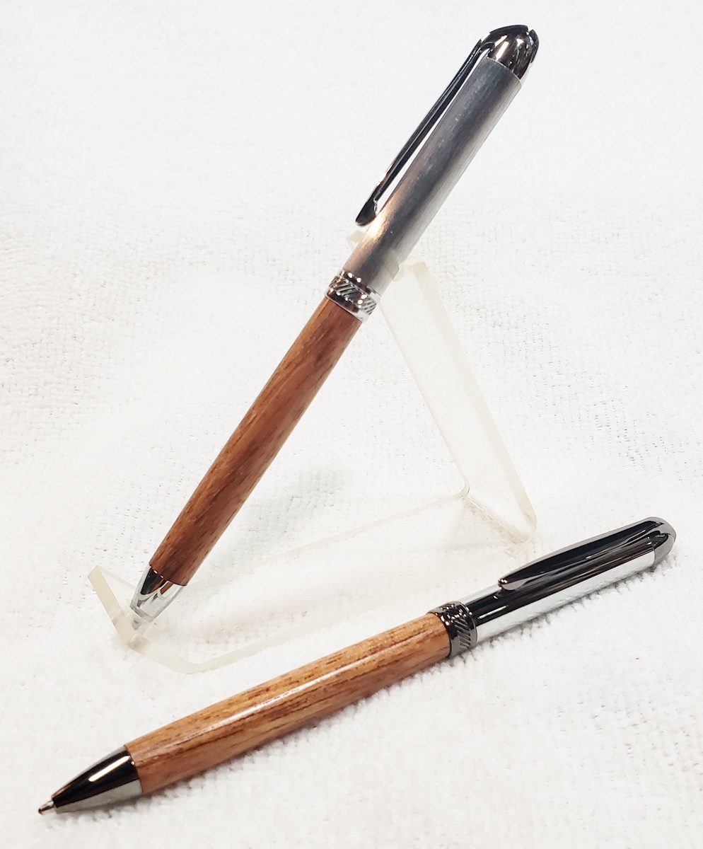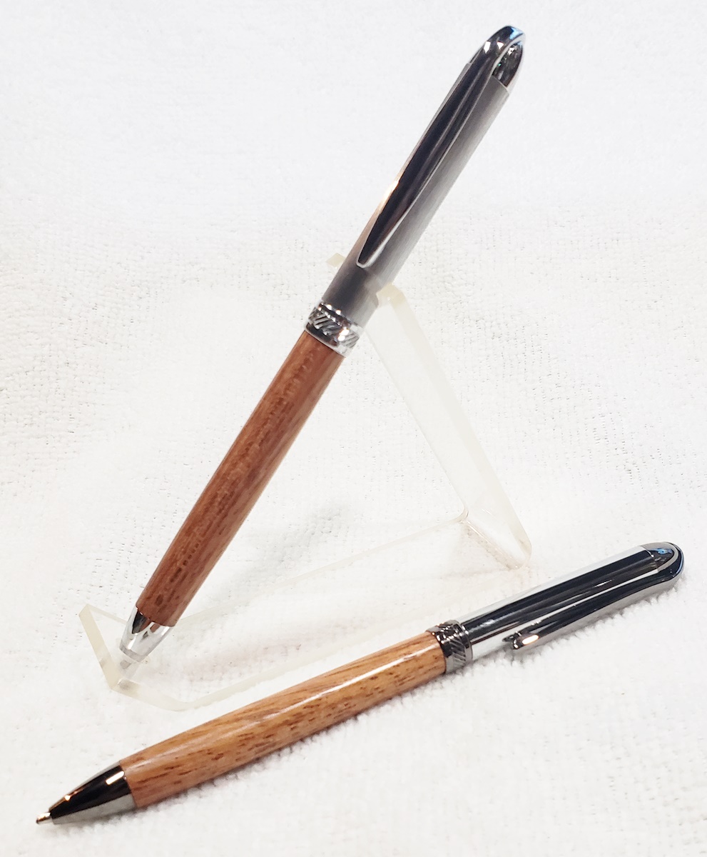 Actually, the chrome/gunmetal is a Slim Hybrid, from Woodcraft. The chrome is a Surfix Duo from Berea. They're the same pen, other than finish. The wood is Brazilian cherry, and the finish is Pens Plus. I'm happy with them.