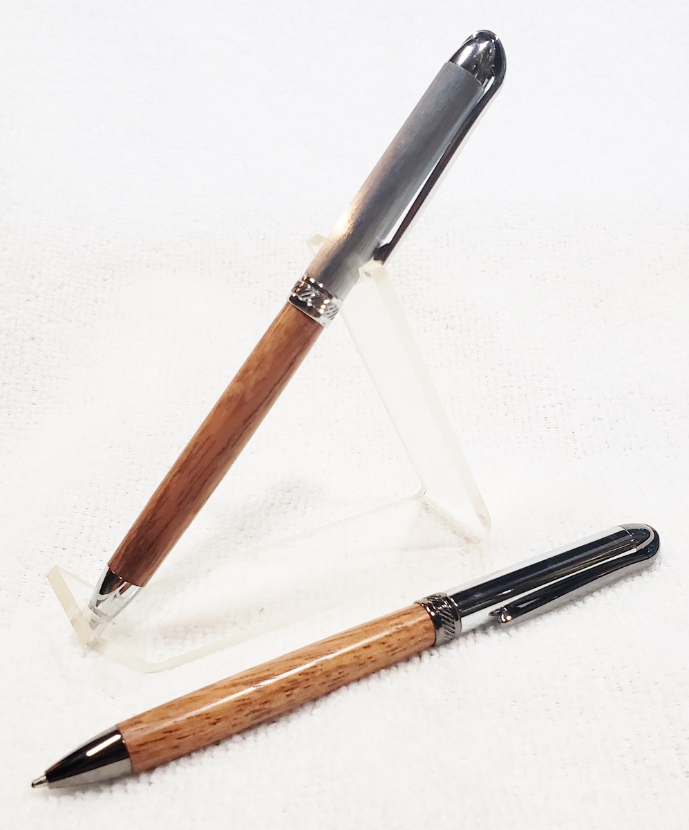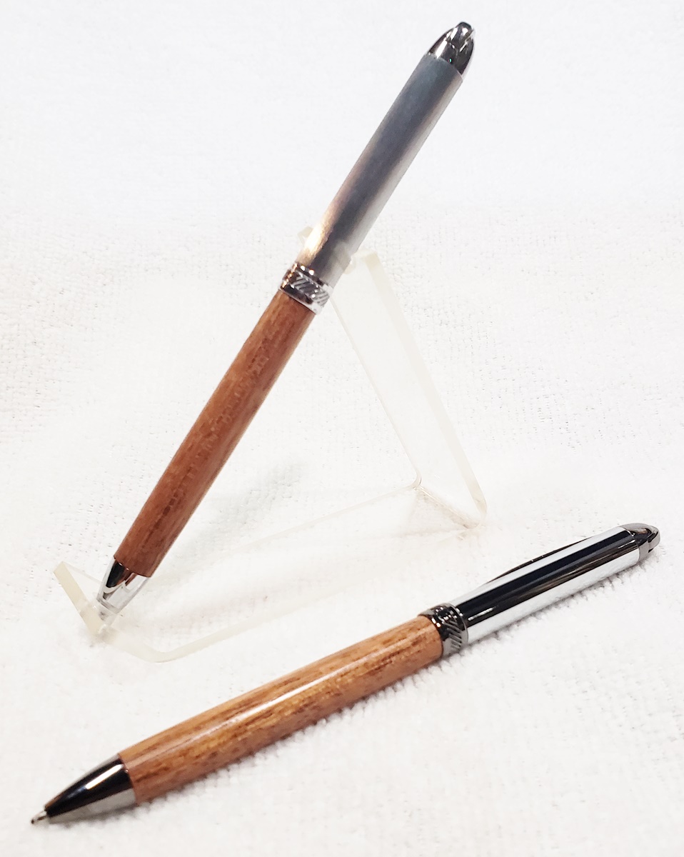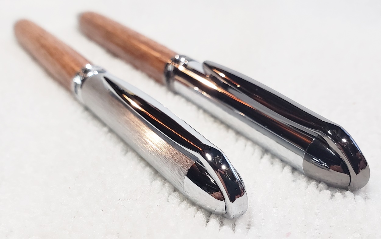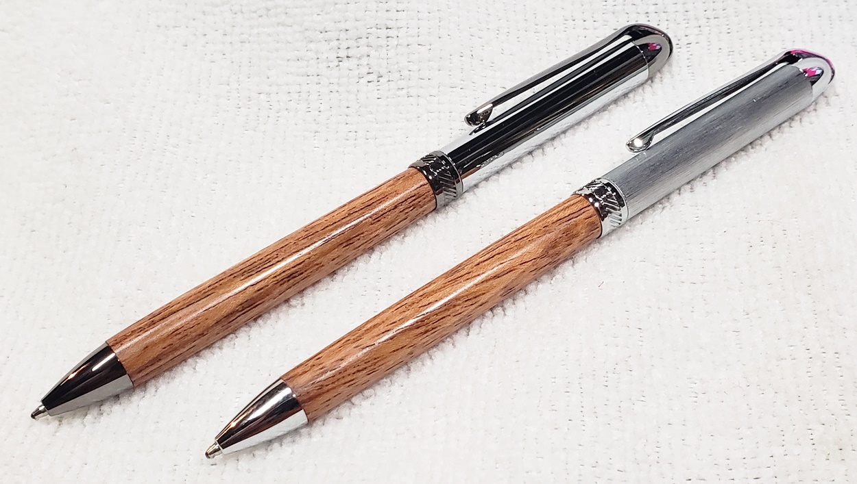 Actually, the chrome/gunmetal is a Slim Hybrid, from Woodcraft. The chrome is a Surfix Duo from Berea. They're the same pen, other than finish. The wood is Brazilian cherry, and the finish is Pens Plus. I'm happy with them.