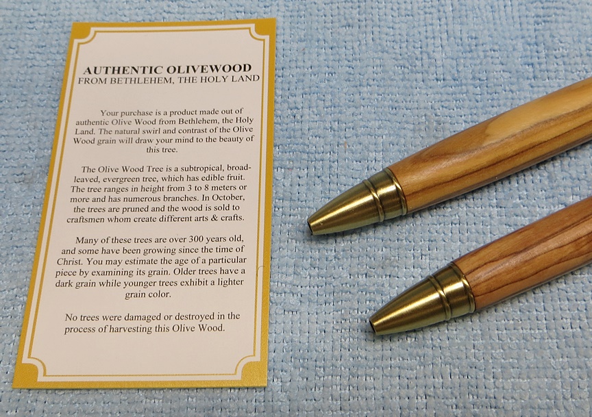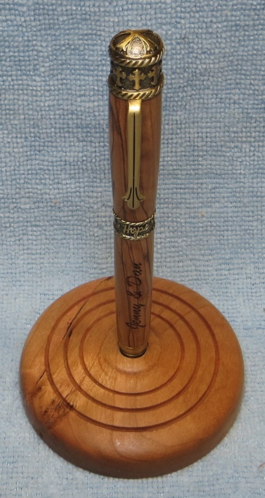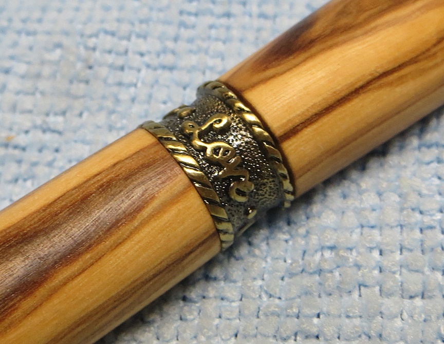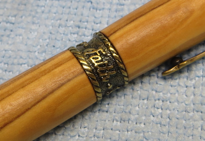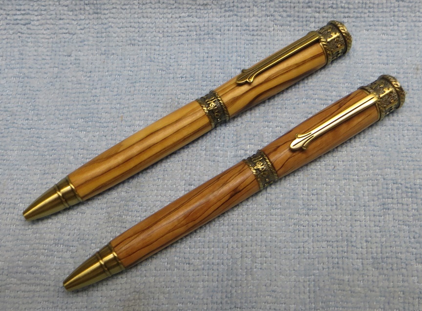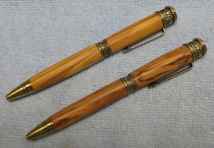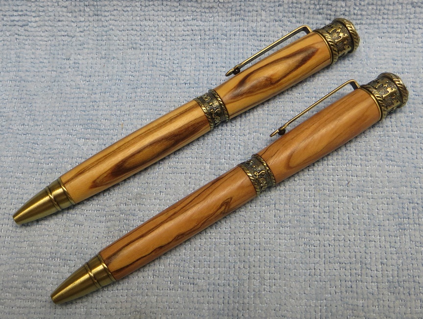 I made this pair of Faith-Hope-Love pens for two couples. One wedding is on New Years Eve, and the other is in May. I chose antique brass pen kits, and Bethlehem olivewood. The finish is Watco Danish Oil. I'll be dropping them off at the engraver today.