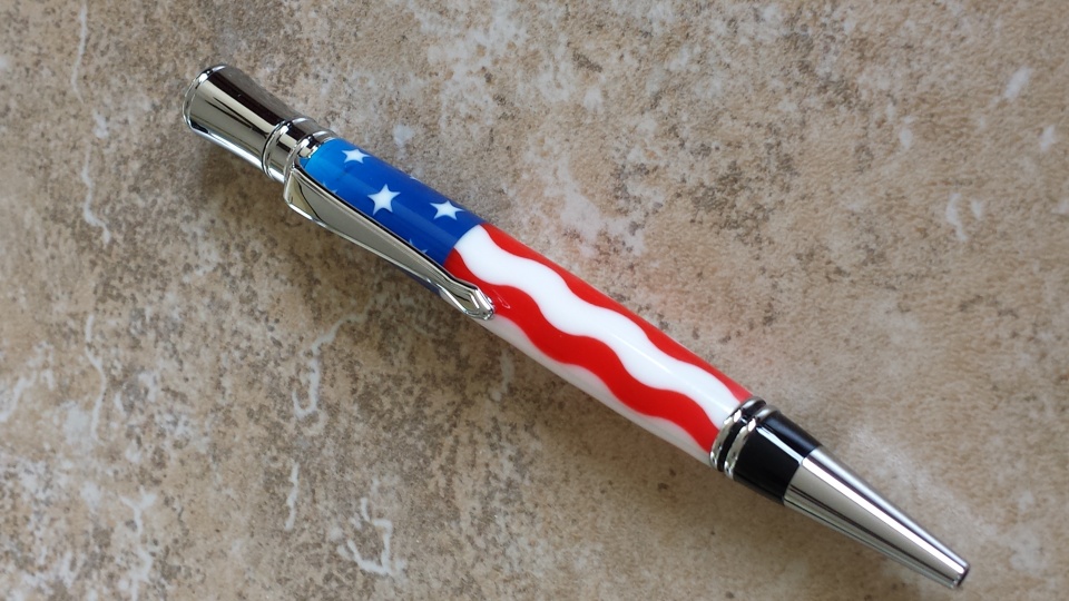 Here is a Stars and Stripes combination I put together this afternoon on a chrome Executive kit. I painted the blanks and tube with white store brand spray paint. The acrylic gets REAL THIN at the ends on this kit and the white shows through a little at the top end of the pen. I guess it's one for the learning curve. I'll fix it on the next one .... I really like this combination so I am pretty sure there will be a next one. Thanks for looking! C & C welcome.