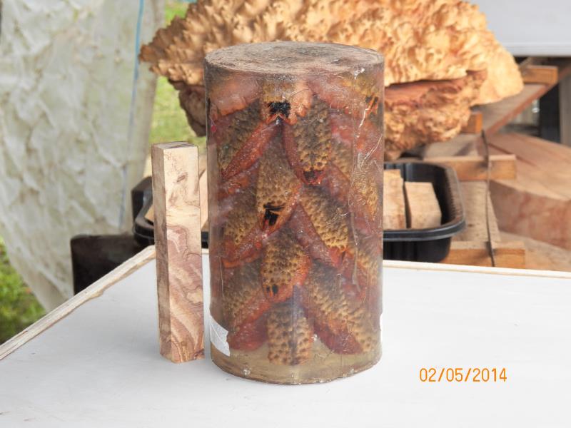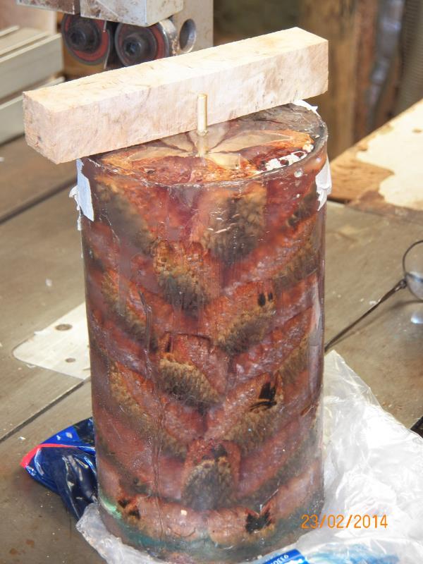 I wanted the cast in clear resin and some of the pod ends (fingers) had to be cut off as they wouldn't fit in a 4" poly pipe I was using as a mold. I trim those ends on the disc sander and some how, it burn the cut, not that makes any difference as that will be turned out slightly.