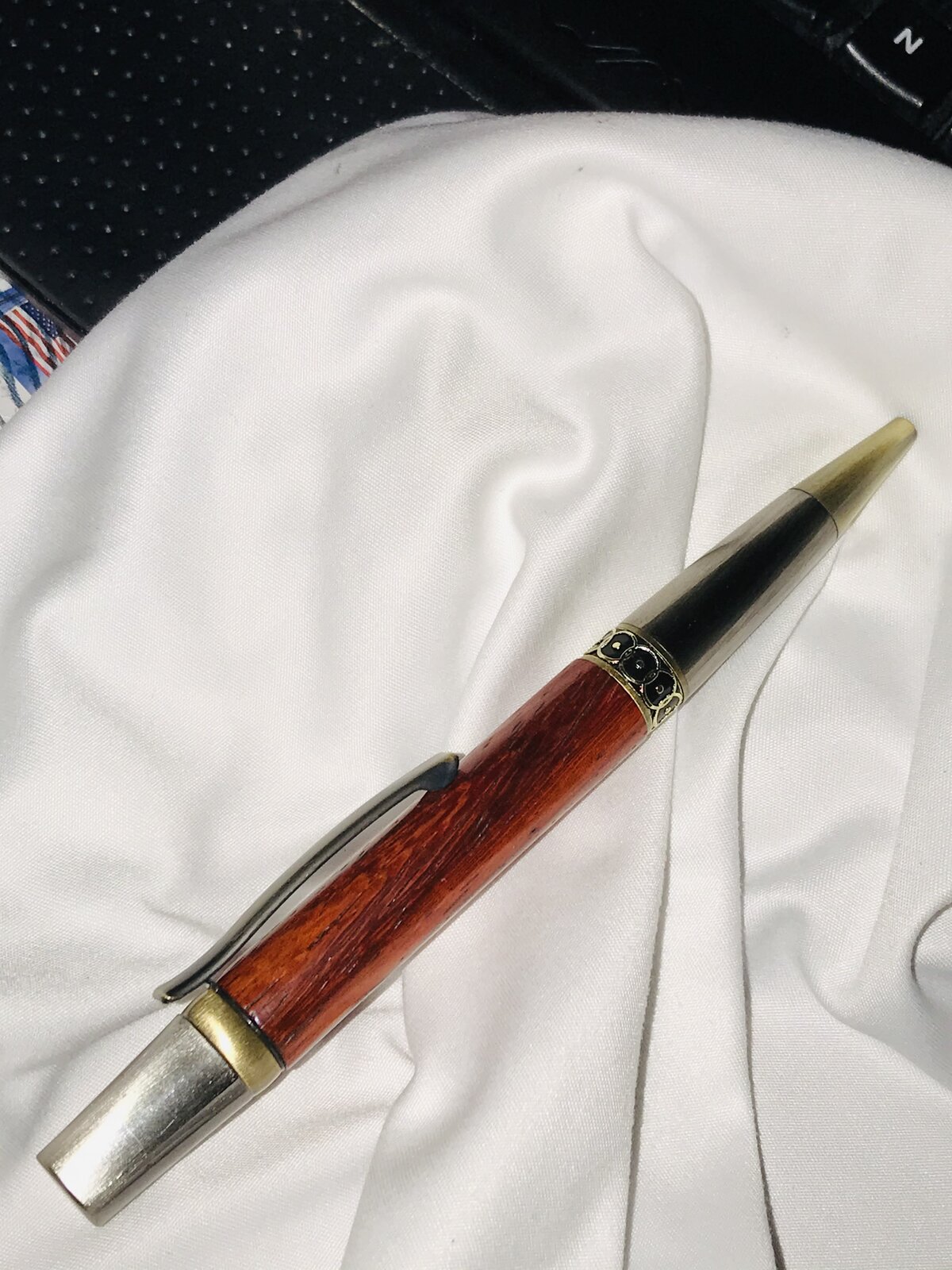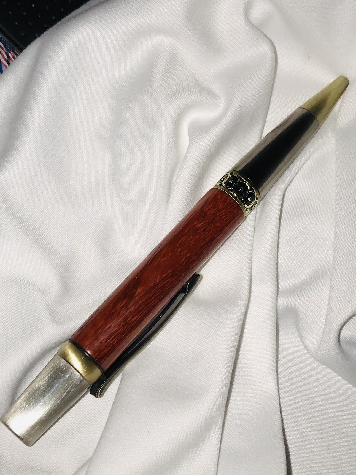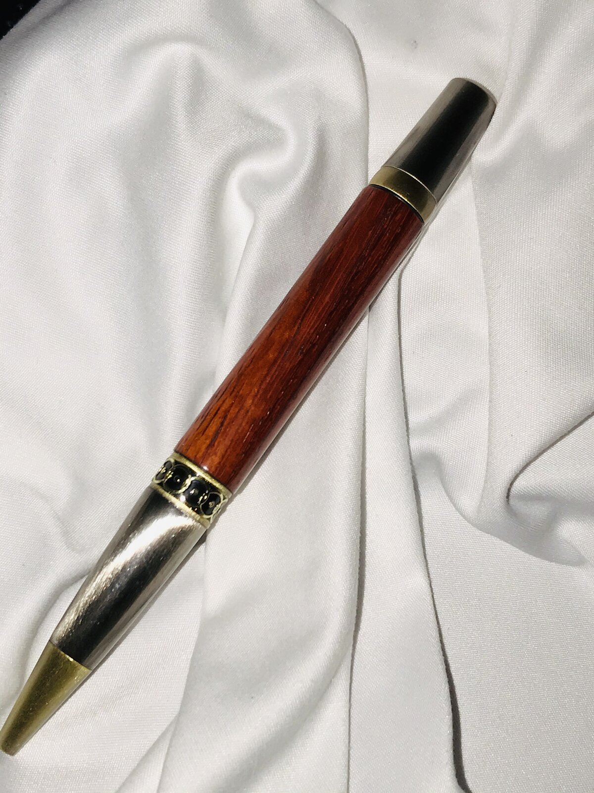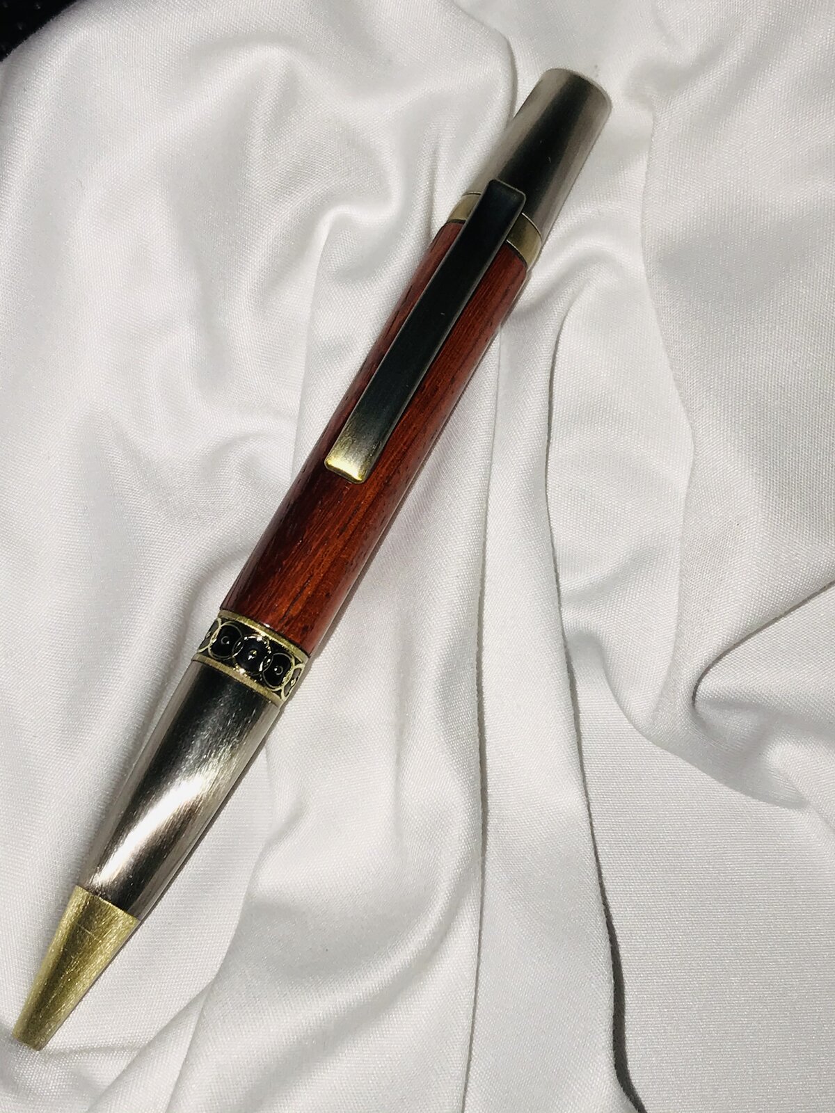 Had a moment in between trying to sharpen knives and got into the wood shop. @TonyL - This is an Ellipse kit, Antique Bronze and Gun Polish (I think) and I followed @ed4copies instructions - option 1. The timber is good old Paduk, a great standby when I can make up my mind. Finish is a little weird; wet sand by hand 320, 400, 800 using Mahoney's, then Black, followed by Tan Mirlon again using Mahoney's. 1 coat Myland's Cellulose sanding sealer, let dry; Black then Tan Mirlon, no Mahoney's. Finally 3 coats Pen's Plus, Black then Tan Mirlon following each coat, after drying to touch. No wax this time - I just forgot it. Enjoy. Comments are welcomed.
