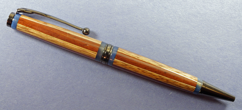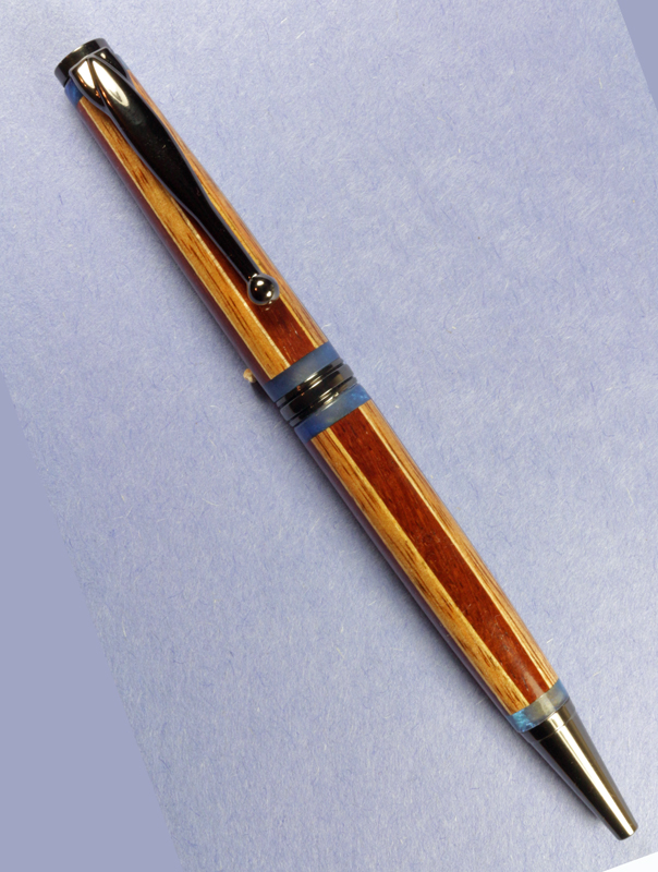 So this was my entry into the segmented pen contest. I think I got about 3 votes. Lol Doesn't matter as the other contenders really had some nice looking work. Just shows me I have a long way to go. Anyway, I took some Mango and Dalbergia wood to make the main body stripes. I then bordered the stripes with some Avodire veneer. I then capped both ends with blue acylic. Thanks for looking!
