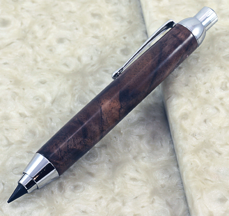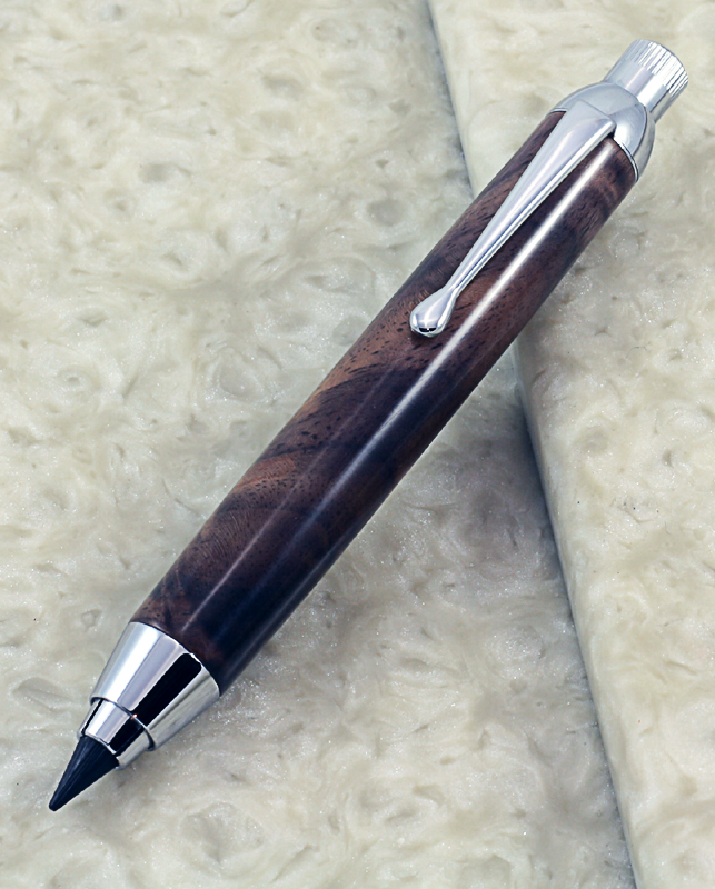 My Brother-In-Law is a cabinet maker. Occasionally he throws some scraps my way. He recently gave me a piece of nicely figured walnut. I decided to give some of it back to him in the form of a shop pencil. I'd never done one of these before so I TBC with no bushings. Finished with CA. I wish I could ge better pictures. These do not do the timber justice.