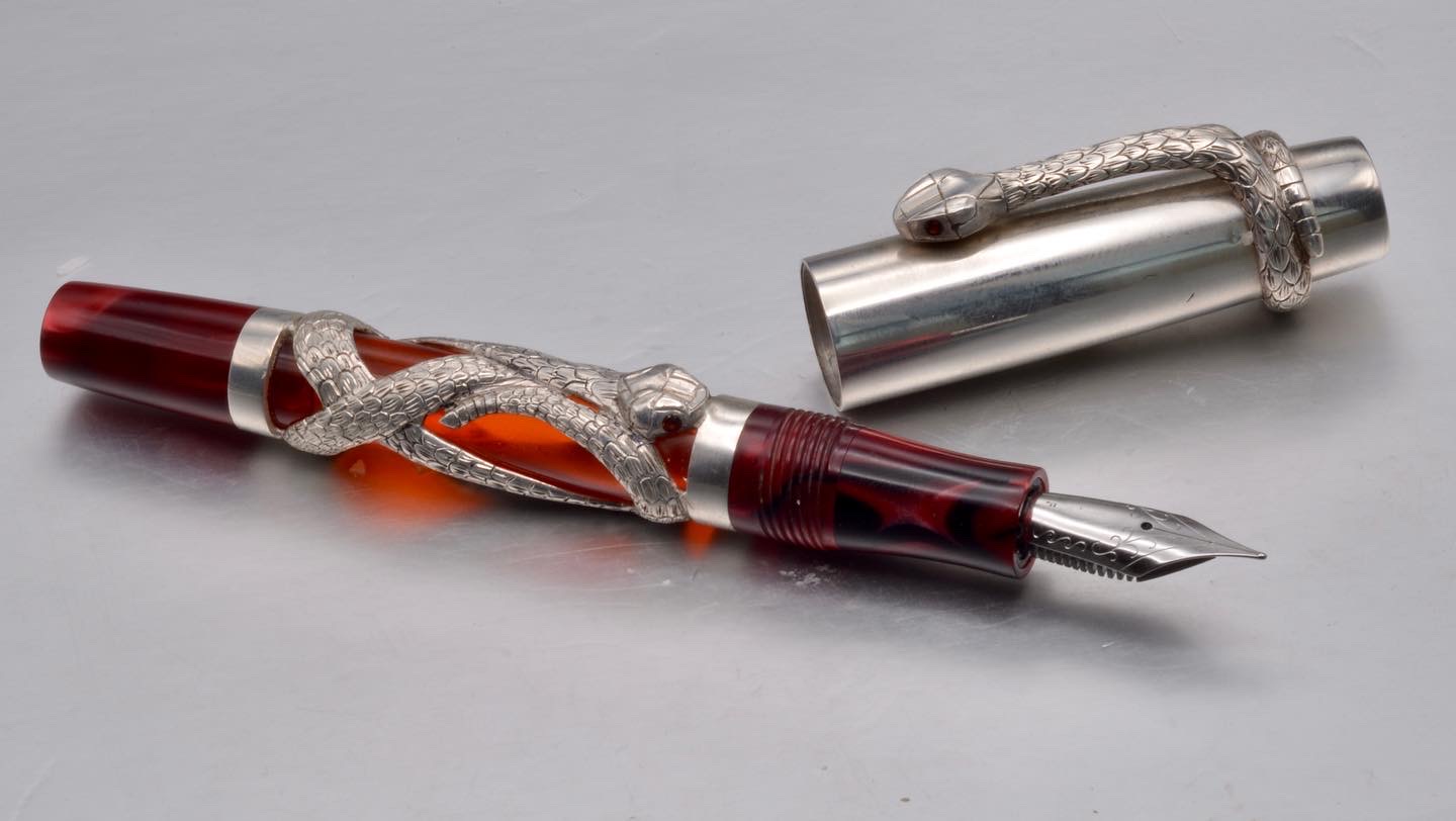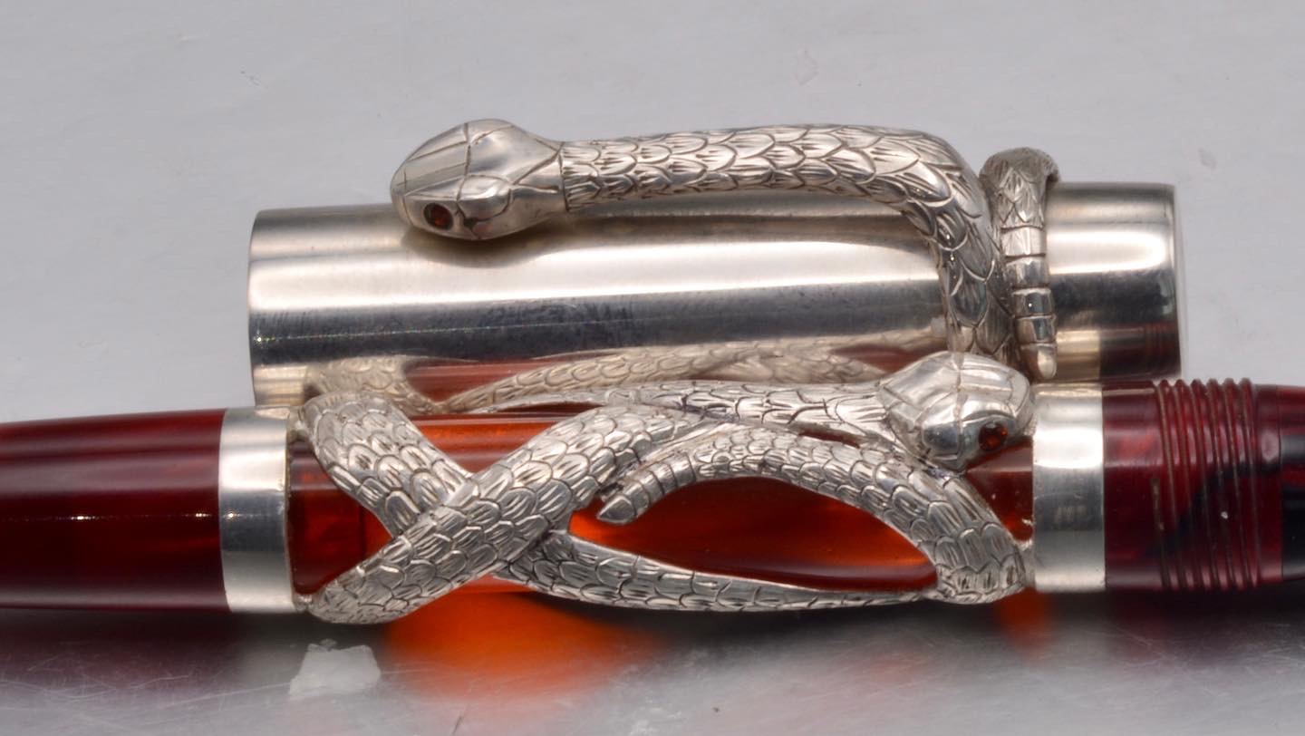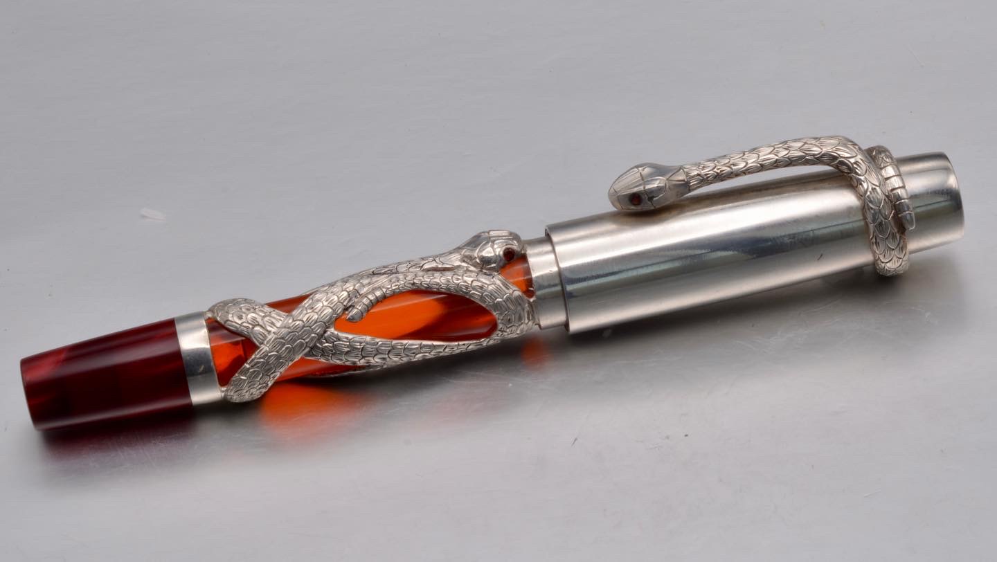 I like making creepy crawly pens. And I love snakes. So this was an idea I had been kicking around for a while. It is a fountain pen with a snake barrel overlay and clip. I used transparent red acrylic for the barrel, with a pearly red kirinite for the section and finial. I carved the overlay and clip from wax and cast them in Argentium silver. I hand engraved the scales and flush set 2mm garnets for the eyes. I made the cap from Argentium silver sheet, with an acrylic liner.