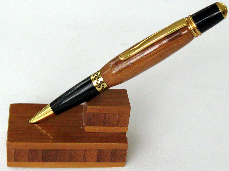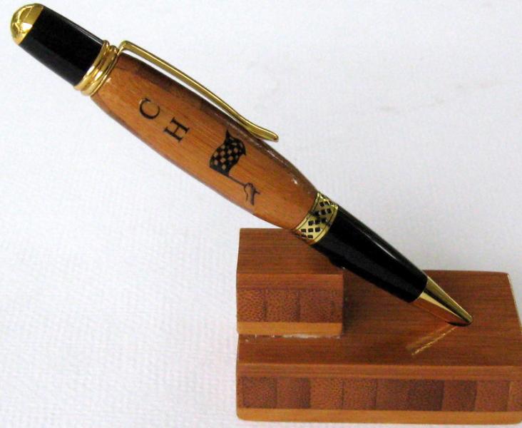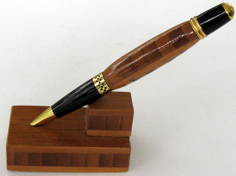 Frank offered to swap pens with me. I took the offer and, when I opened the flat rate box, I had a pleasant surprise inside. I found this Mesa pen with segmented Bamboo along with a stand of the same material and, Poly finish on both pieces. He cut-out my initials and, a hand waving a checkered flag since he learned I'm an avid fan of Nascar. To fill in the space in the box, he included some really nice wood blanks, including the Bamboo that the pen and, stand were made from. I think I got the better part of this trade :biggrin: Thanks Frank! And, a BIG THANKS for your service to our country.