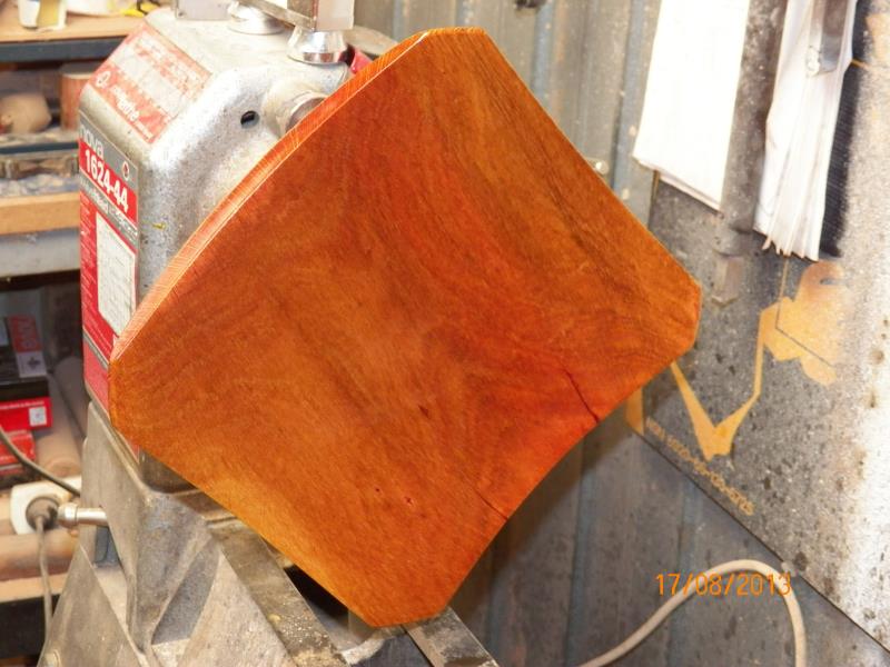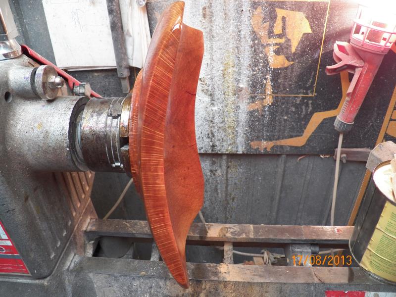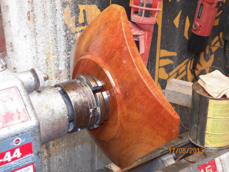 Is is a piece made from a slab cut from the best log I salvage from a tree that I cut for my auto-mechanic friend about 18 months ago. The wood is just no dry enough to pay with so, I decided that was time for me to make another "Gift" piece for my mechanic friend, every tree that I cut for him that is usable for wood-turning, he gets at least one piece turned for it so this time was a tree that he planted about 20 years ago but far too close to the power line and it grown a lot bigger than he ever anticipated so, after the Power company made a mess out of it, cutting its top in "L" shape, was time to get the tree down and solve the problem once and for all...!