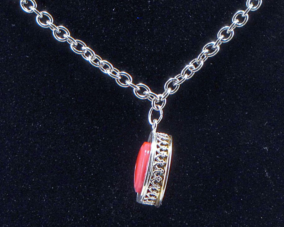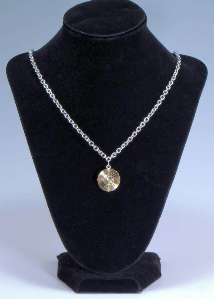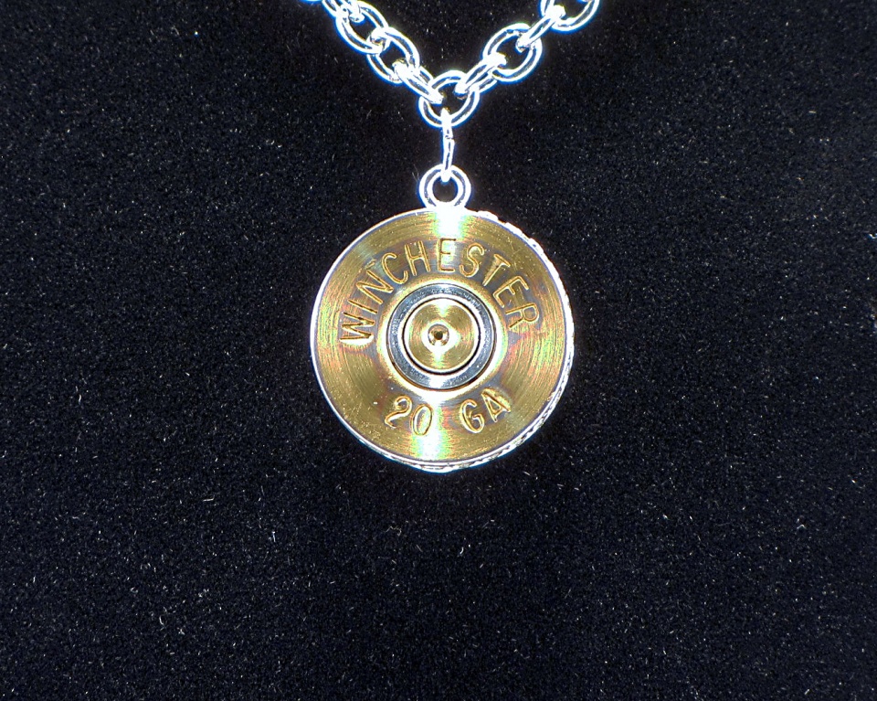 Edit: The chain and loop do not go with the pendant, she has her own chain. Mine is just there for the photo and is dime-store stuff. Also note that although the primer end appears to be brass, it is not, it is steel with just a flash plating of brass. It took very little polishing to expose some of the steel substrate. It has a heavy coat of lacquer on it to prevent/delay any tarnishing of the little bit of brass or rusting of the steel. Hopefully she will only be wearing it... I don't know... hunting maybe. ;-)